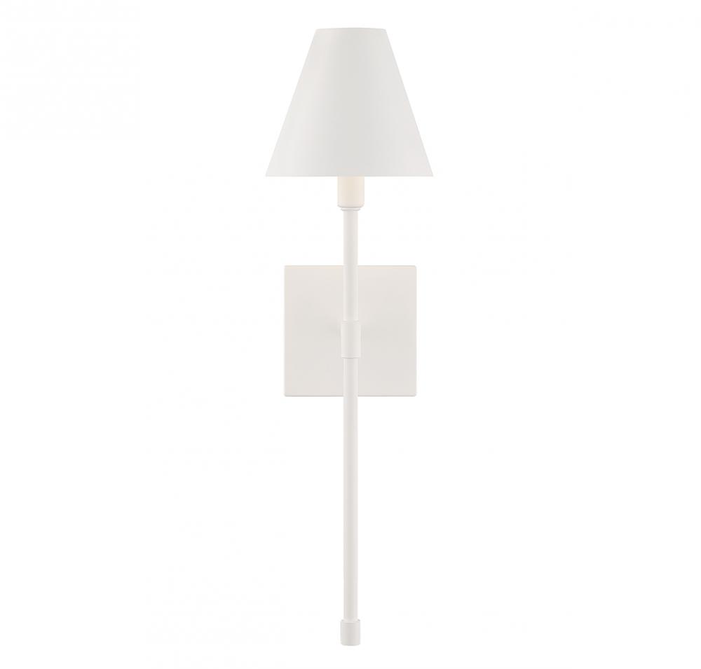 This Savoy House Jefferson 1-light sconce features a long sleek body, a metal shade for indirect illumination and a classy, contemporary silhouette. Bisque white finish. Jefferson is 20" in height, 5.5" in width and extends 7" from the wall. It uses a candelabra size bulb with a max of 60 watts (bulb not included).