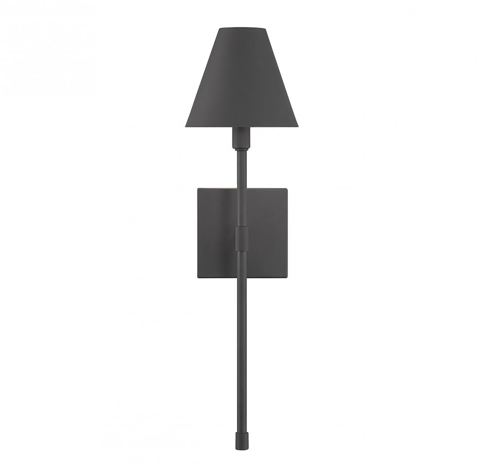 This Savoy House Jefferson 1-light sconce features a long sleek body, a metal shade for indirect illumination and a classy, contemporary silhouette. Matte black finish. Jefferson is 20" in height, 5.5" in width and extends 7" from the wall. It uses a candelabra size bulb with a max of 60 watts (bulb not included).