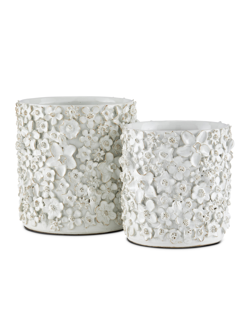 With a surface that is studded with beautifully fashioned white flowers, the Jessamine Small White Cachepot is truly an artisanal piece. Rather than apply one type of bloom, a number of floral shapes are intermingled to give the white decorative accessory a charm. The handmade character of the piece comes from the fact that each flower is created individually and applied, one-by-one, by hand. The white planter will be a plant's biggest complement.