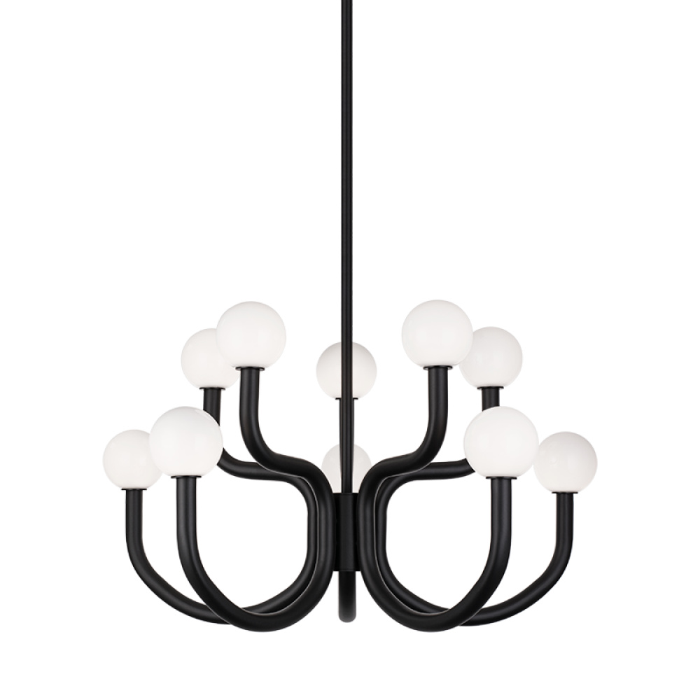 With flowing arms featuring round Opal glass, the Joelle incorporates a mix of style and elegance that could enhance the visual impact. Finishes include chandeliers and wall sconces in Aged Gold Brass and Matte Black.
