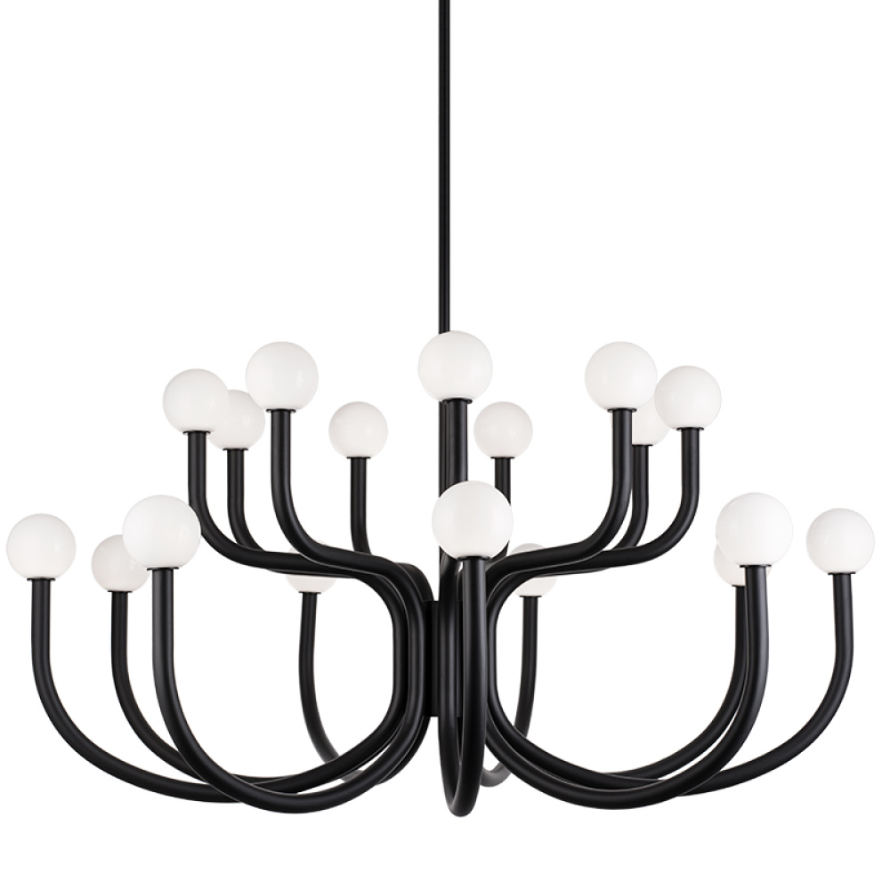 With flowing arms featuring round Opal glass, the Joelle incorporates a mix of style and elegance that could enhance the visual impact. Finishes include chandeliers and wall sconces in Aged Gold Brass and Matte Black.