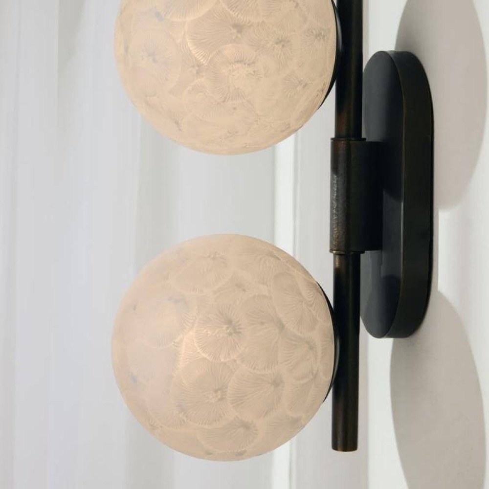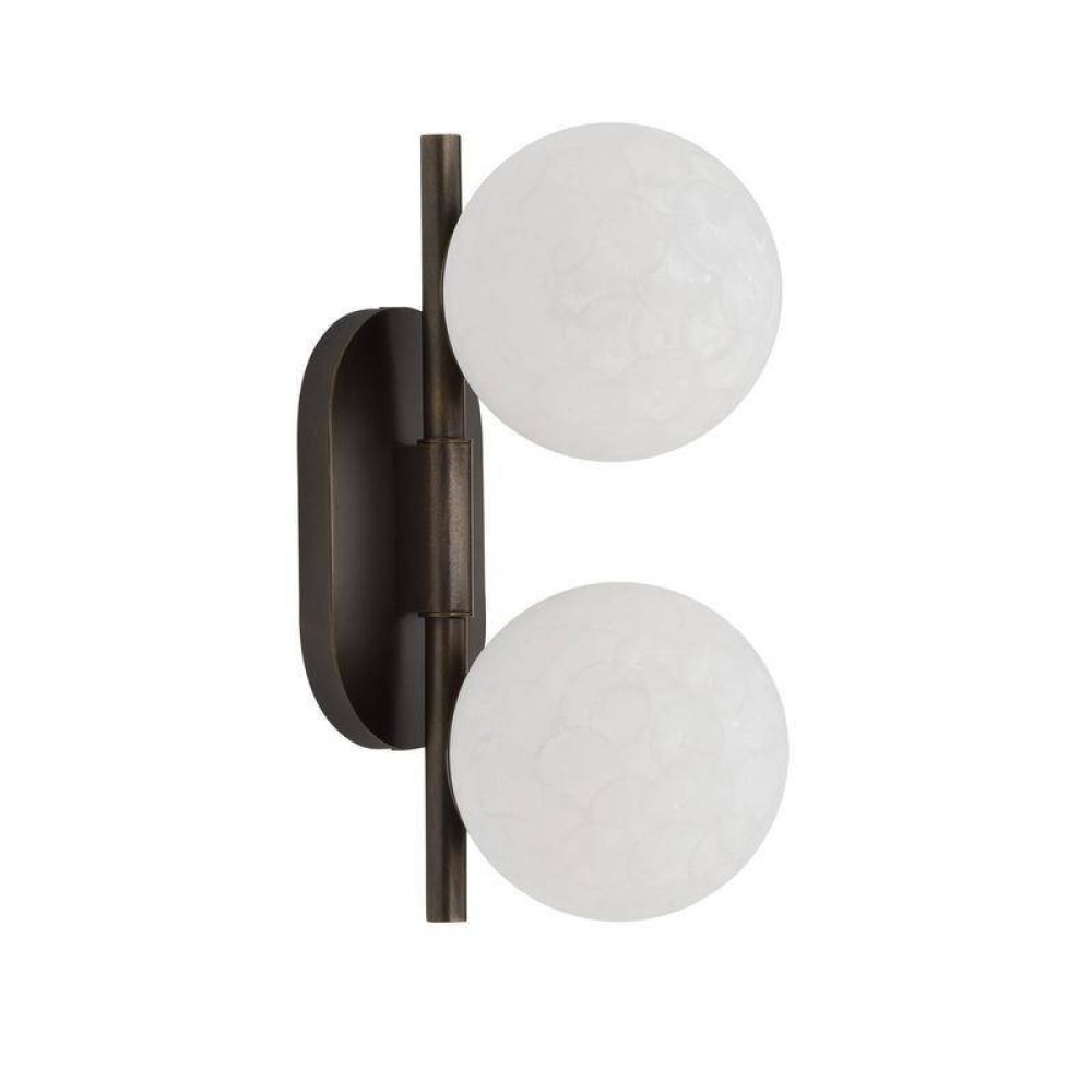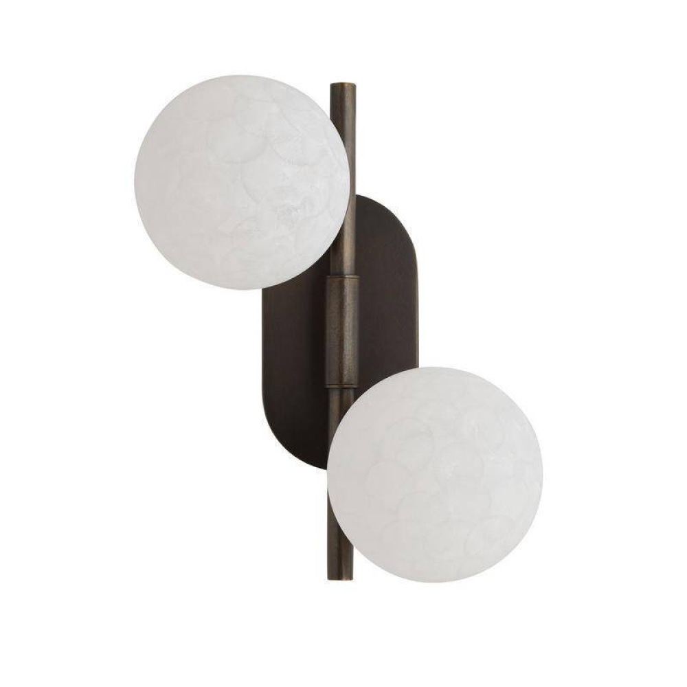 Like the moon orbiting around a planet, double globes of matte white textured glass offer a lunar allure. Finished with a stony coral texture, this clever celestial-inspired fixture's globes can be rotated left or right to deliver light where it is needed most. Mounted on a backplate of English bronze-plated steel. Finish will vary. Damp-rated, although limited, covered outdoor conditions may affect finish.