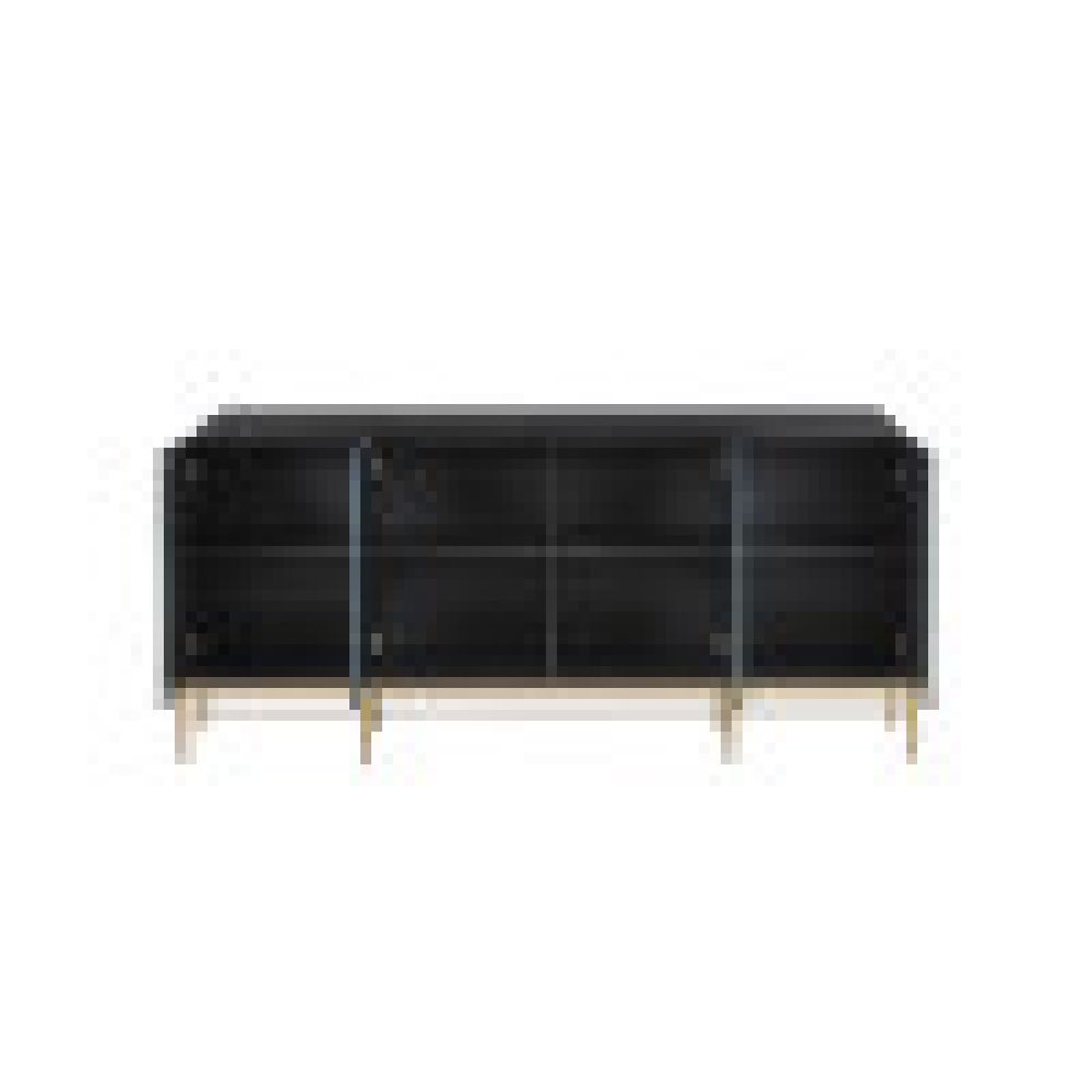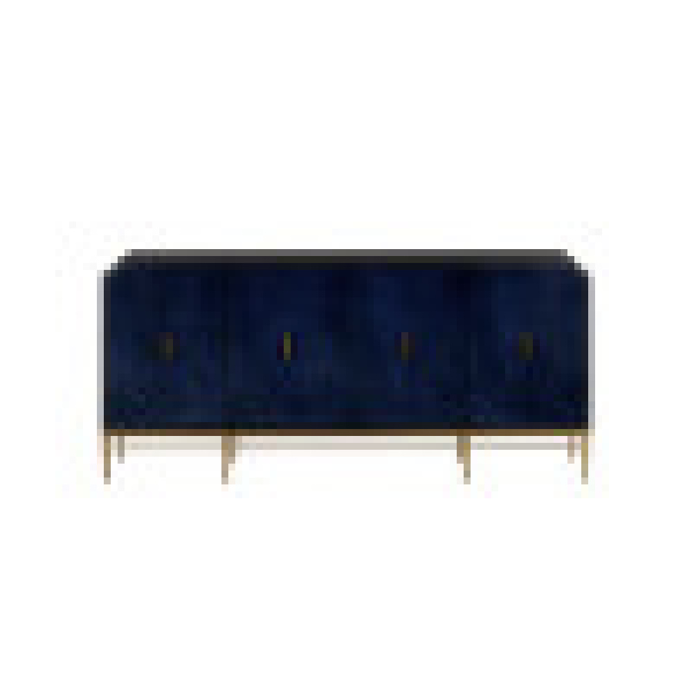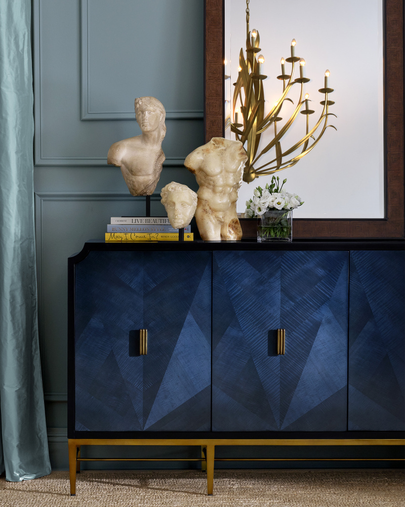 The Kallista Blue Credenza has a dark sapphire blue finish that enlivens the sycamore veneers cladding its doors. These are set into a caviar black credenza sitting atop a metal base in an antique brass finish, which matches the tone of tailored door pulls. The way the wood veneers are applied brings depth, texture, and movement to this navy-blue credenza that is dressy enough for the most sophisticated home office and the most refined business settings.