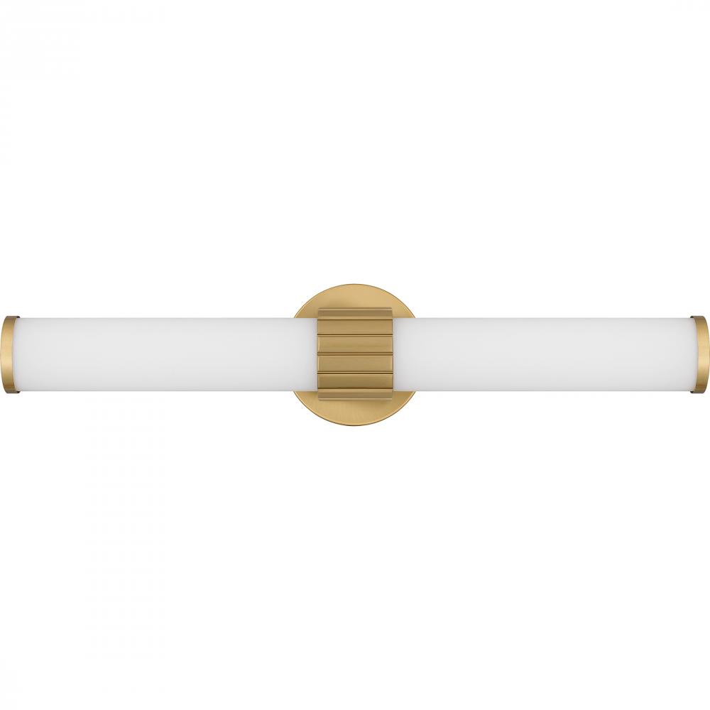 Upgrade your bathroom with the modern style of Kaye. An integrated LED light source shines brightly through the linear etched glass shade, complemented by sleek metal bands. Choose from a variety of sizes, available in your choice of matte black or aged br