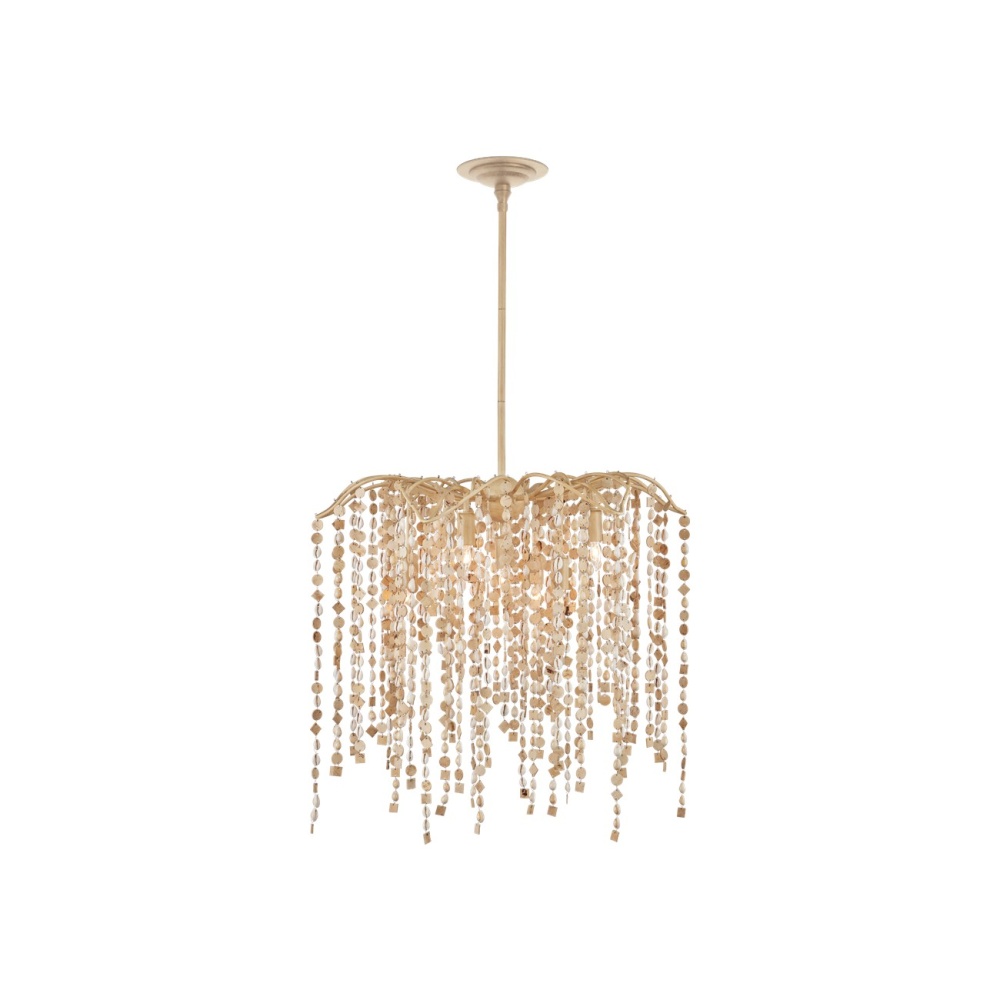 The Kealia Medium Chandelier drips with hand-beaded natural cowrie shells and small pieces of coconut shells that flow down from an undulant floral-shaped frame to make it a biophilic design. The natural materials form a veil-like shade that surrounds seven lights that create a patterned illumination. The curving frame is made of thin ribs of wrought iron in a coco cream finish to complement the earthy tones of the natural materials. Adjustable from 30" to 72" with use of included chain/rod kit/cable. If your space calls for a longer drop, additional chain/rods/cable is available for purchase.