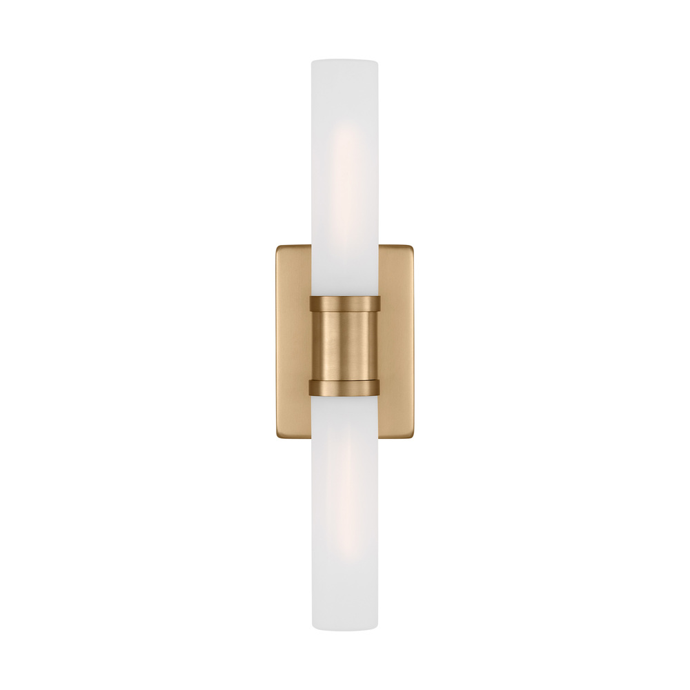 Sleek and modern, this 2-Light bath series pairs a square backplate with tubular etched white opal glass shade. The Keaton two light vanity fixture in Satin Brass provides abundant light for your bath vanity, while adding a layer of today's style to your interior design.
