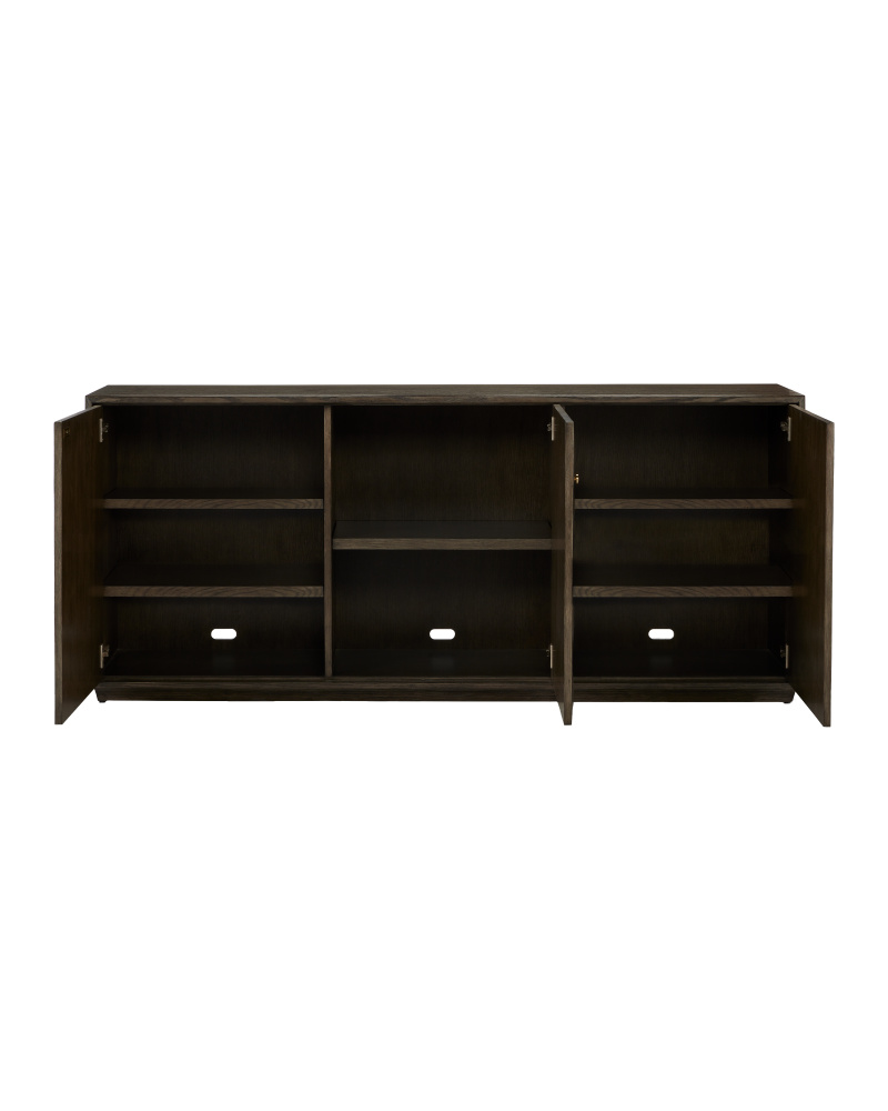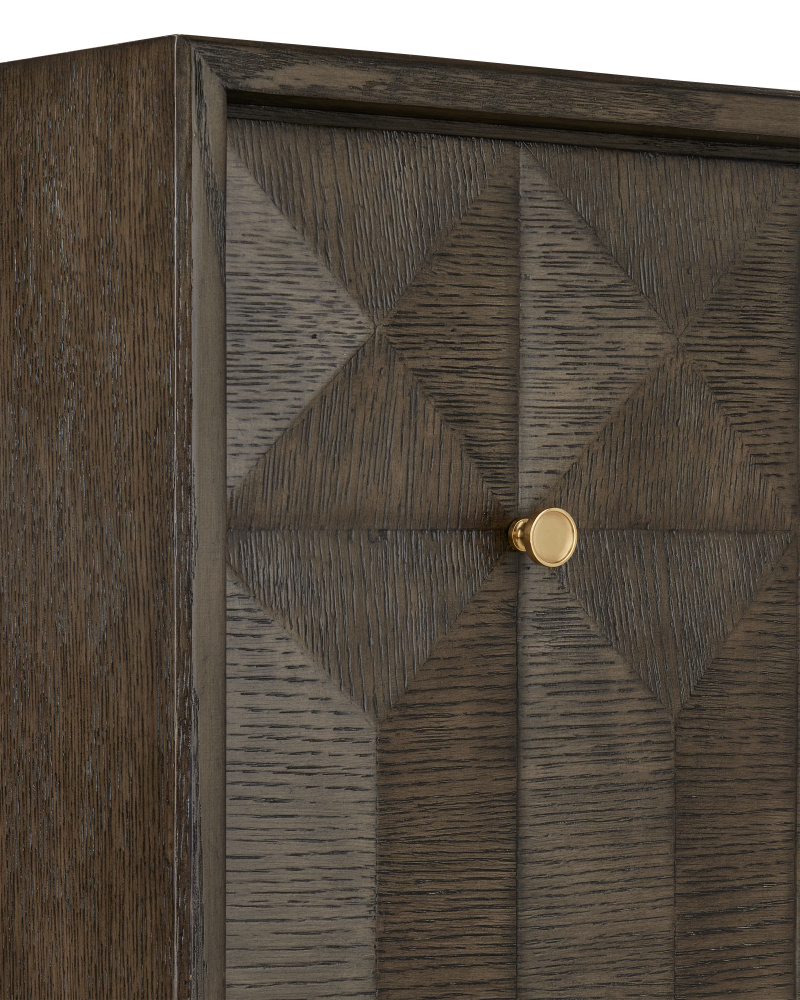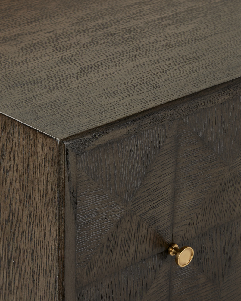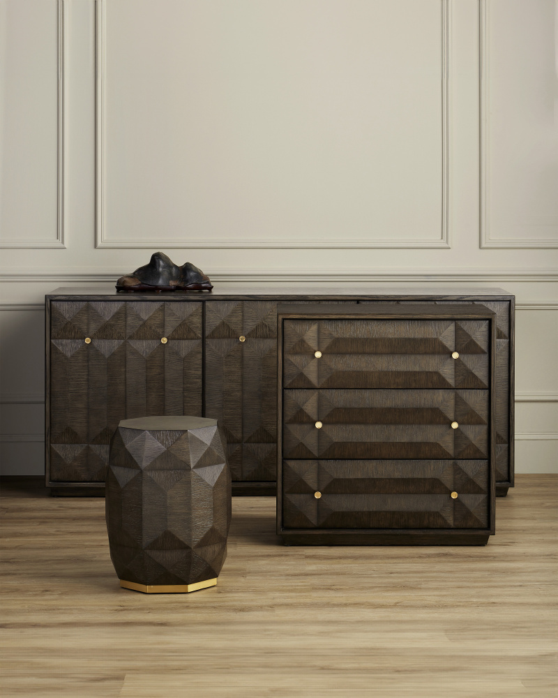 The Kendall Dove Gray Credenza has a geometrically striking profile created by the interplay of peaks and valleys on its door-fronts. It is made of oak solids and veneers with surfaces in a dove gray finish that have been wire-brushed to accentuate the grain in the wood. The faceted dark brown credenza is jewel-like, the metal pulls in a polished brass finish adding a glimmering touch to the warmth of the gem-like home-office credenza.