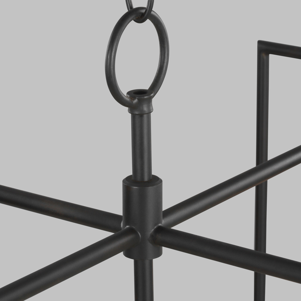 The Keystone six light billiard island chandelier in aged iron enhances the beauty of your home with ample light and style to match today's trends. An exposed candelabra pairs with an angular, Aged Iron frame to ensure the Keystone family casts a warm and inviting glow. This series of chandeliers, sconces and pendants designed by Chapman & Myers for Visual Comfort Studio features very detailed construction including bobeches supporting each candle tube. The chandeliers highlight the popular wagon wheel silhouette.