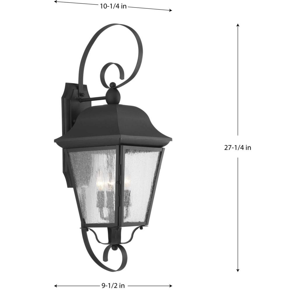 Black finish.;Updated classic style.;Seeded glass panels with traditional detailing.;Easy access for relamping.