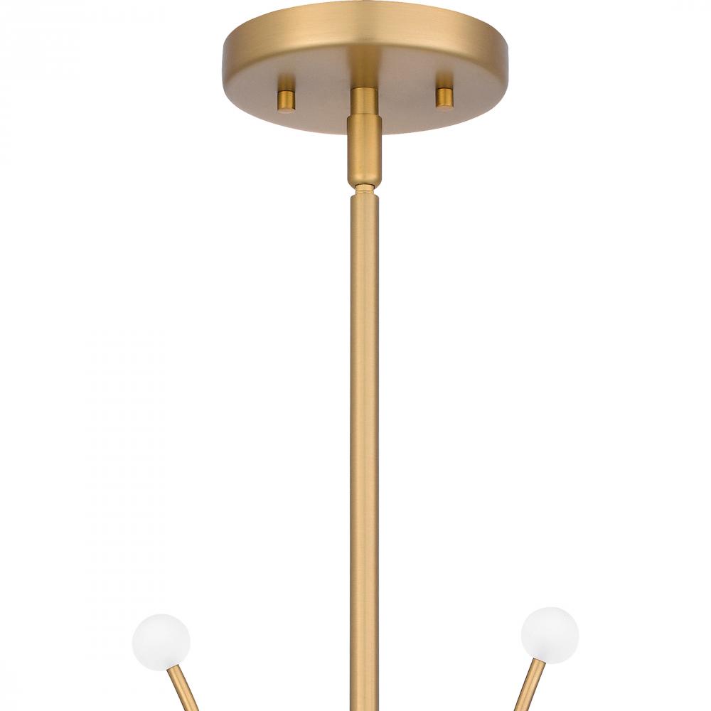 Kiera radiates on-trend, modern style. The captivating chandelier features a futuristic design with sleek, curving lines and small white spherical accents. Kiera is available in two beautiful finishes - choose brushed weathered brass for a slightly retro v