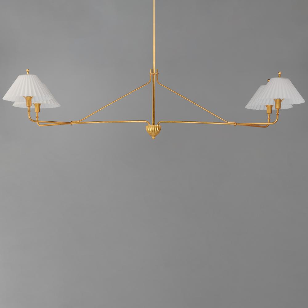 Touches of biophilic details and charming Satin White glass shades modeled on pleated fabric shades create elegant and approachable lighting fixtures. Finished in a rich hand-applied gold leaf, the elongated frame of the chandelier and upturned sconce take