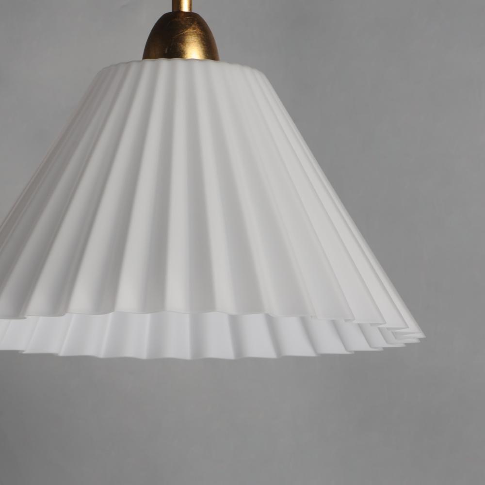 Touches of biophilic details and charming Satin White glass shades modeled on pleated fabric shades create elegant and approachable lighting fixtures. Finished in a rich hand-applied gold leaf, the elongated frame of the chandelier and upturned sconce take