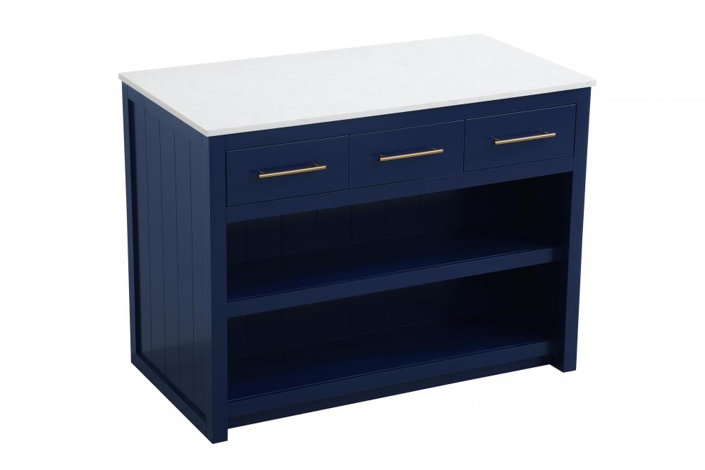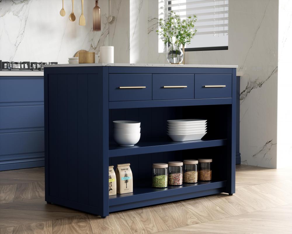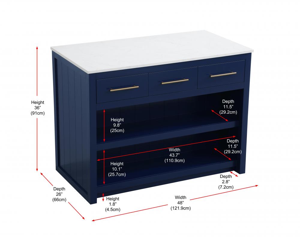 Designed for both practicality and style, the island includes three soft-close drawers with French dovetail construction for storing your kitchen tools and an open shelf for additional storage or display. Built from solid wood and MDF, this island is as durable as it is stylish. It’s available in three finishes—blue, natural oak, and white—offering flexibility to complement your kitchen’s aesthetic. with the added convenience of adjustable foot levelers for stability and shipping fully assembled, this kitchen island is ready to elevate your space in no time.