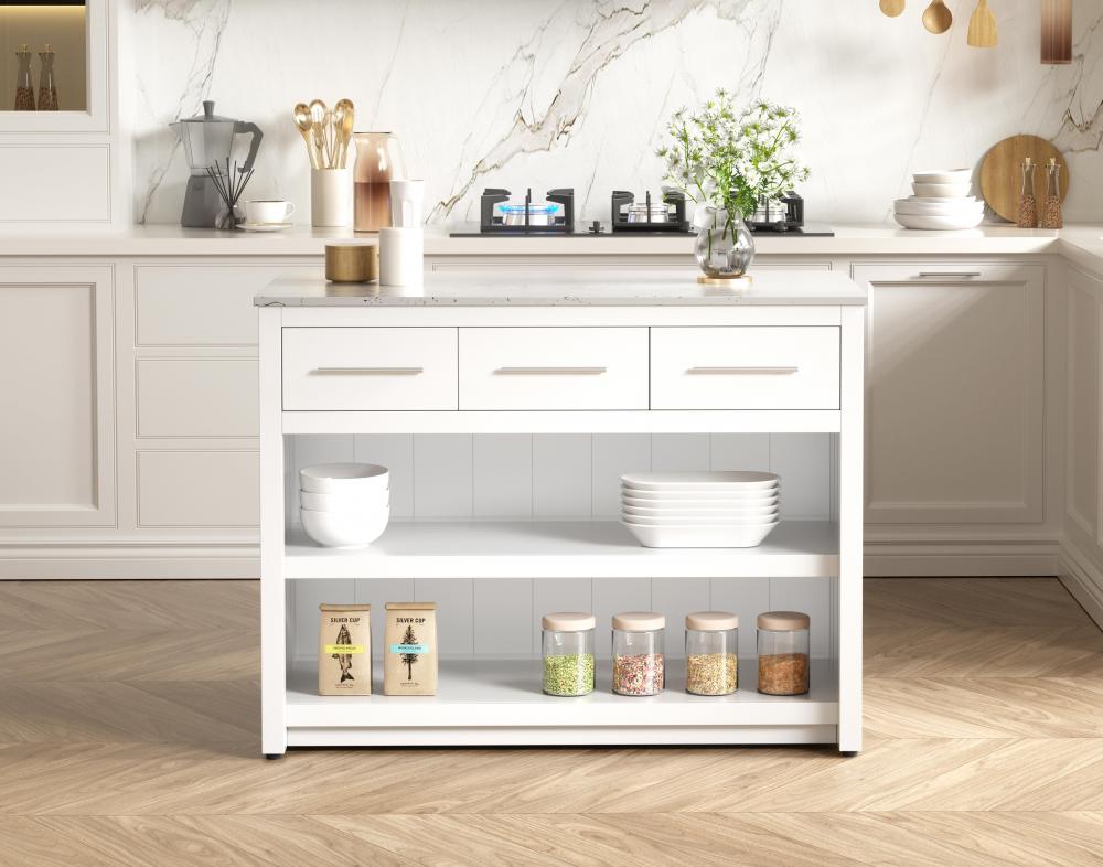 Upgrade your kitchen with this versatile kitchen island that combines functionality and style. Measuring 48" L x 26" W x 36" H, this piece features a sleek engineered marble countertop perfect for meal prep or casual dining. The overhang on one side provides space to seat two barstools, making it an ideal solution for cozy breakfasts or entertaining guests.