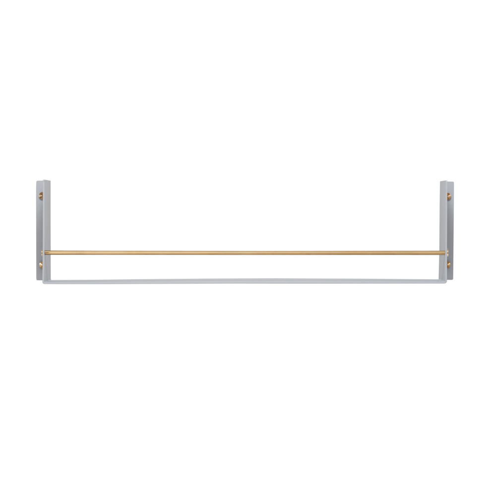 A heavy-duty shelf made from laser cut 4mm sheet aluminium, press bent into shape and powder coated. The shelf features a hand polished, 12 mm hand polished solid metal rail and is finished with matching Buster + Punch coin screws.