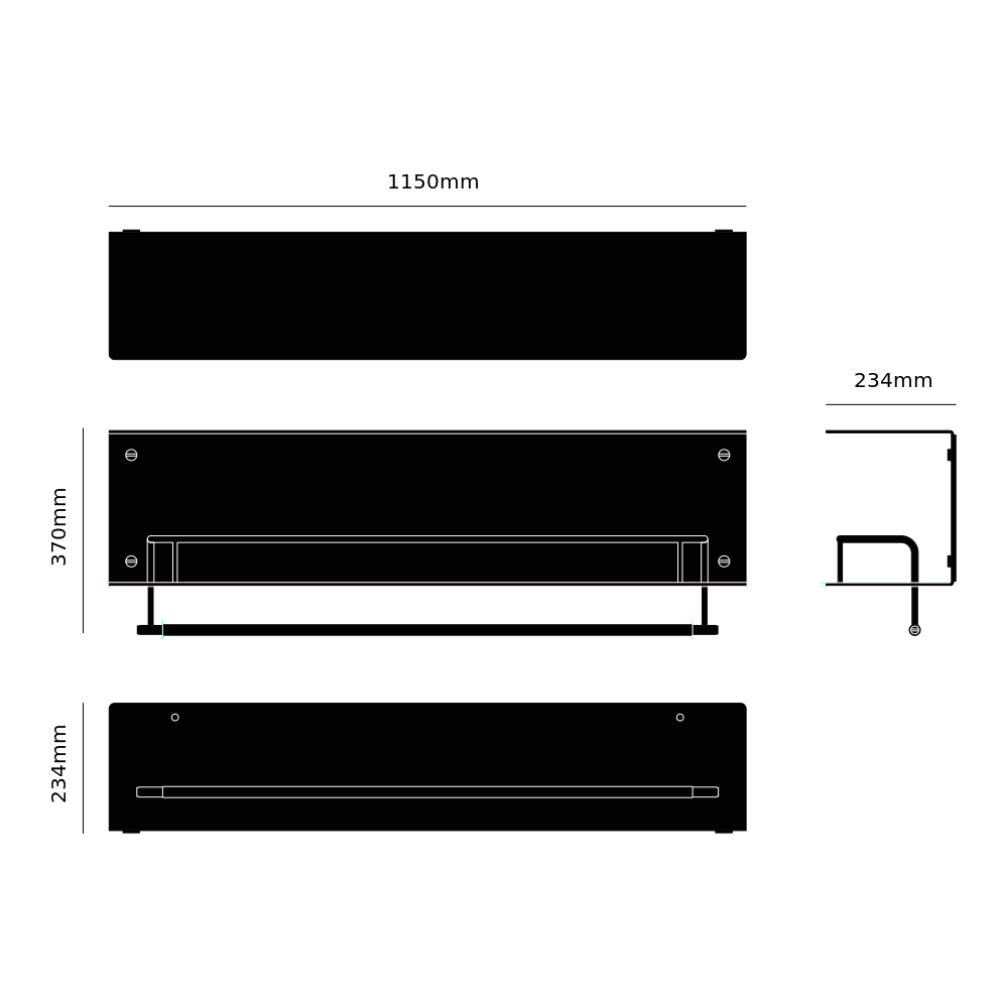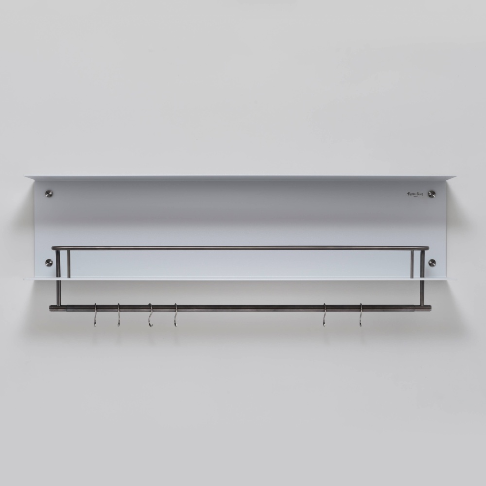 A heavy-duty shelf made from laser cut 4mm sheet aluminium, press bent into shape and powder coated. The shelf features a hand polished, 12 mm hand polished solid metal guard rail and 20mm pan rail, both finished with matching Buster + Punch coin screws. The shelf comes with 6x S hooks to hang utensils off the pan rail