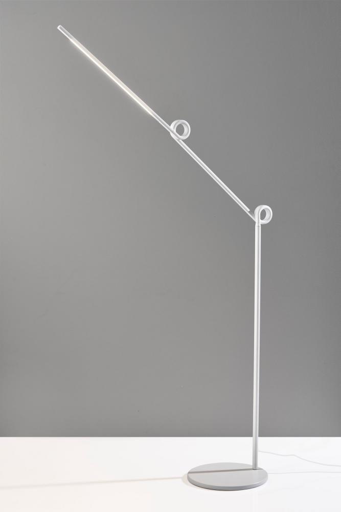 Bring a unique visual impression to your space with the contemporary Knot LED floor lamp. The round base and thin tube in white finish present clean lines that are accented by decorative flourishes at each of the two inflection points. The direction and height of the light can be adjusted at these points, allowing you to direct the light wherever it's needed. Whether it is positioned to be tall and narrow for a room corner or angled for accent lighting behind sofas or recliners, this floor lamp is the ideal choice for any sized space. The long, narrow integrated LED brightens any room with 650 lumens diffused through a frosted shade, while the 3,000K color temperature adds a touch of warmth and intimacy. A discreet 4-way touch switch adjusts the brightness between low, medium, high, and off, allowing you to select the perfect lighting level for your needs. A white fabric-covered cord completes the monochrome design. The floor lamp is also available in black finish to complement industrial or modern stylings. Complete your décor with the coordinating Knot LED desk lamp.