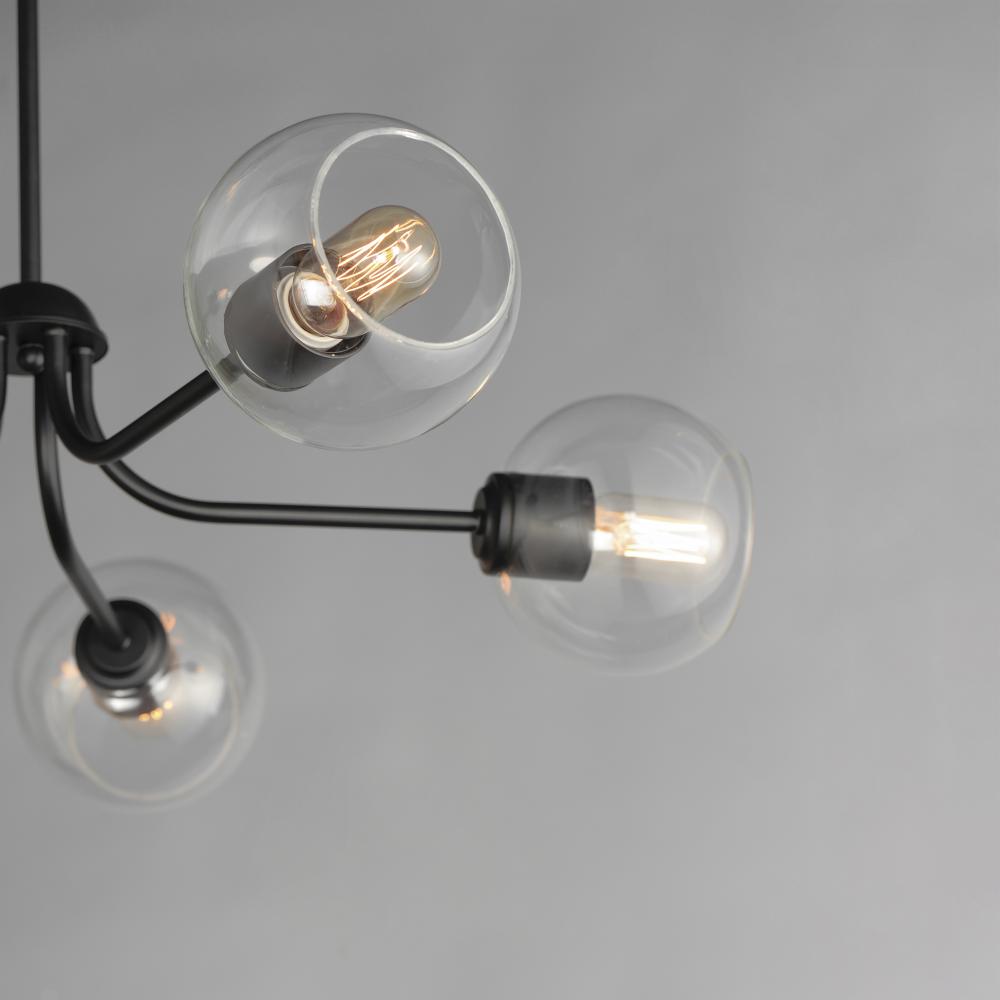 Clear glass globes on a Natural Aged Brass frame create a transitional design that is sure to please. The sloping arms level out to create a simple Mid Century Modern configuration. A full range of the products in this collection include chandeliers, penda