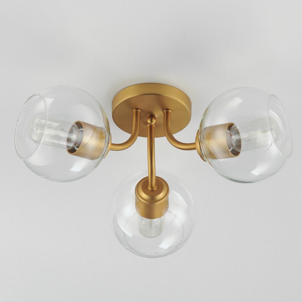 Clear glass globes on a Natural Aged Brass frame create a transitional design that is sure to please. The sloping arms level out to create a simple Mid Century Modern configuration. A full range of the products in this collection include chandeliers, penda