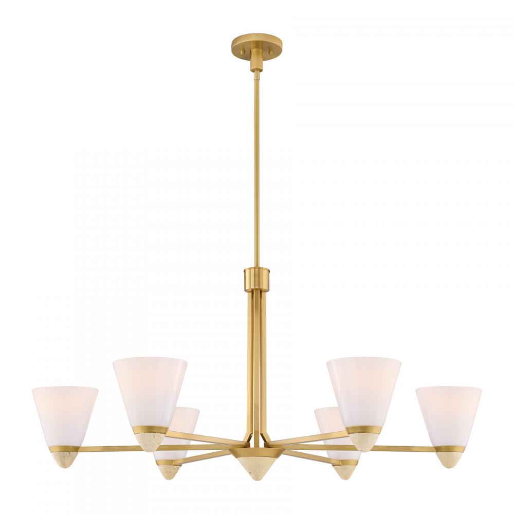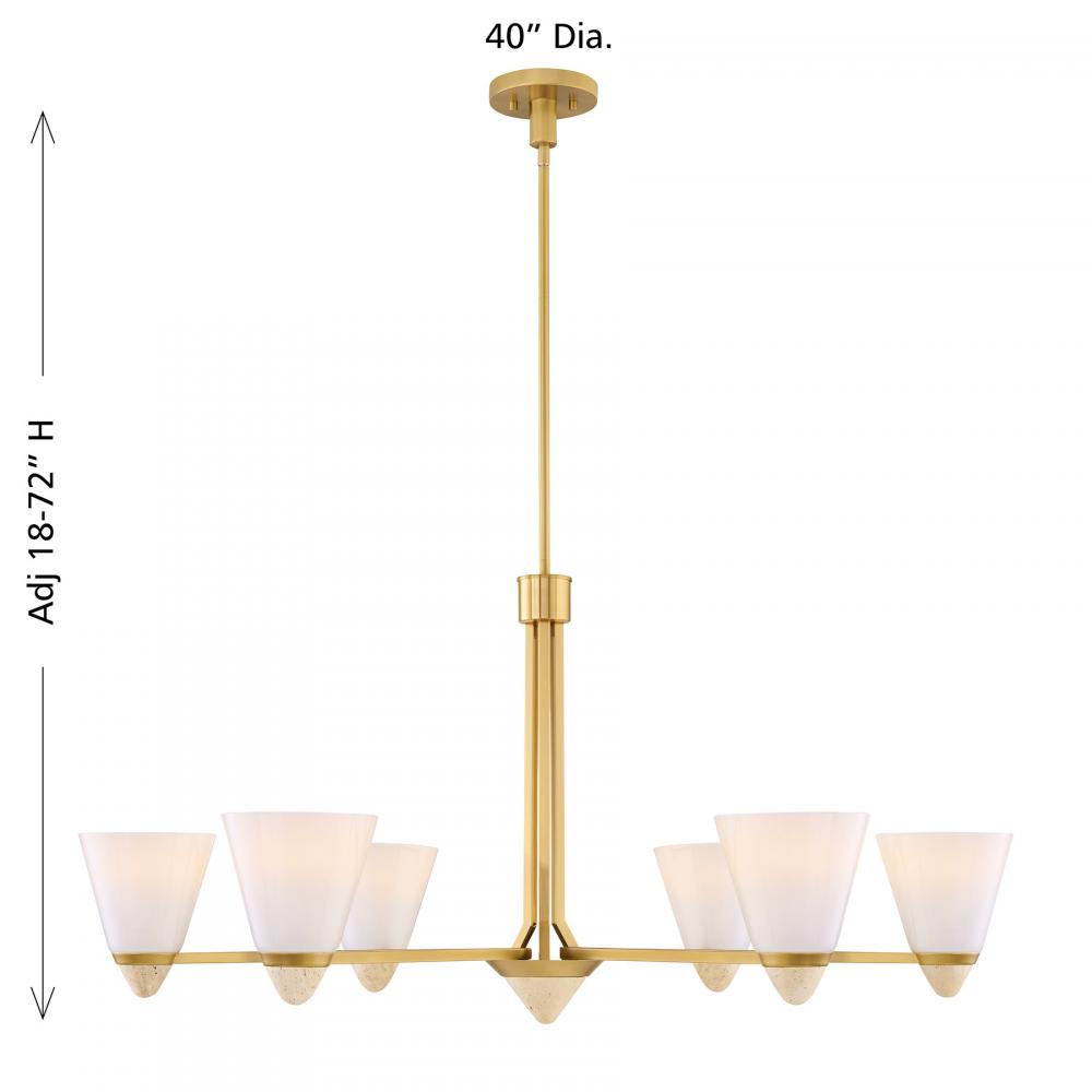 The Savoy House Kohlman 6-light chandelier is a perfect balance of the elegant and the organic. It flaunts conical shades of white opal glass paired with natural travertine accents and a Warm Brass finish. Another travertine accent serves as the finial of the chandelier. Kohlman is 40" in width and has an adjustable height ranging from 18" to 72". It uses six standard size bulbs of up to 60 watts per bulb. Bulbs not included. Comes with four 12" downrods and one 6" downrod.