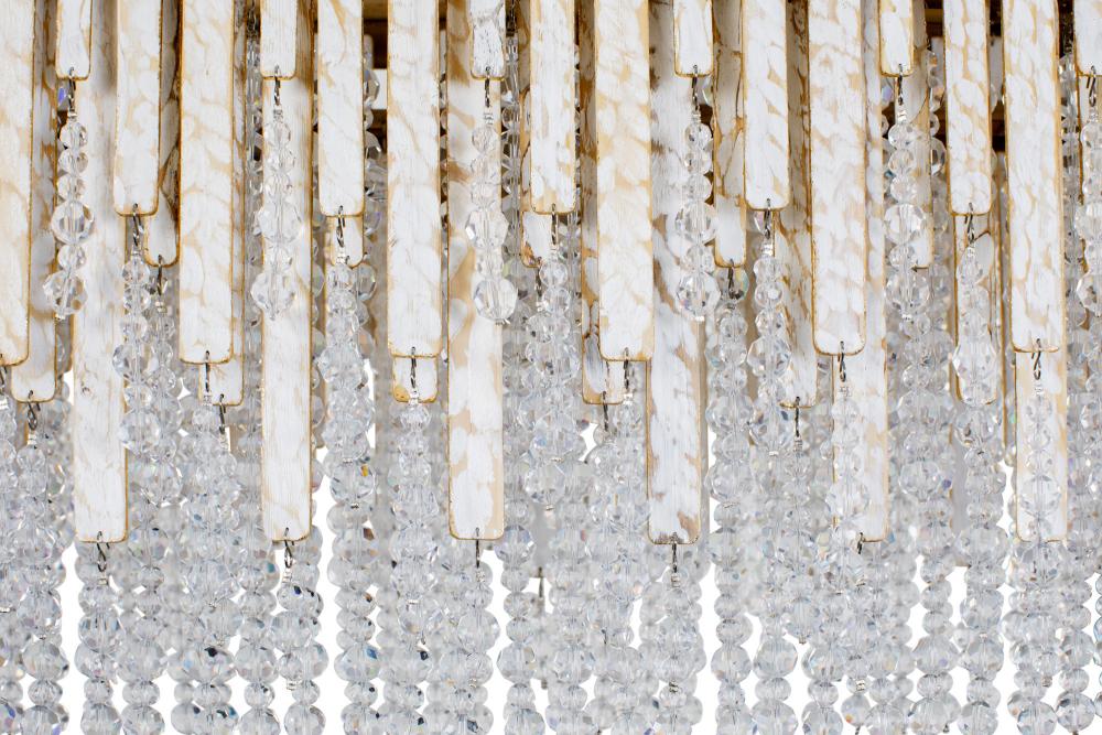Ignite the swank and sultry soul of New Orleans. From feelings of a warm breeze blowing over a porch with gauzy drapes, to the decadence and passion of a smoky jazz club, Lafayette is sure to set the mood in any room. Echoing the look of live oaks with Spanish moss on dewy mornings, crystal beads sparkle around the hand-carved, white-and-gold washed reclaimed wood strips.