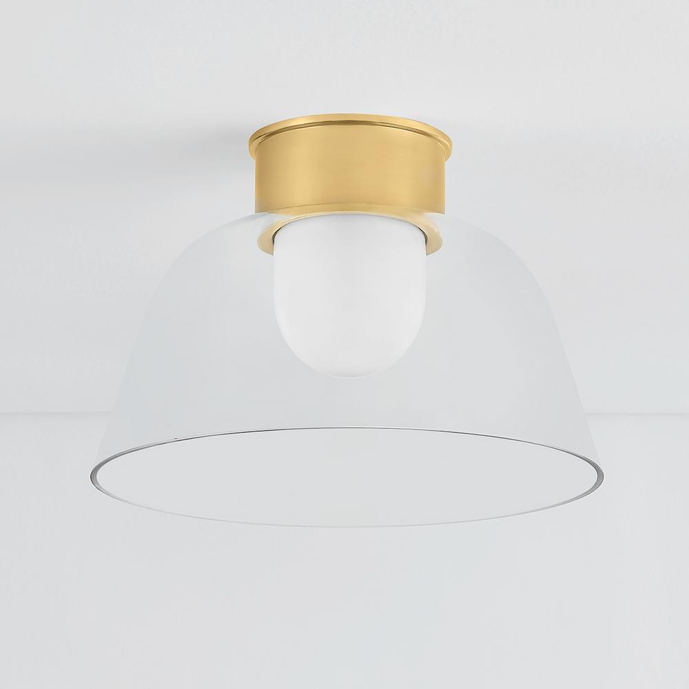 A celebration of the beauty of pared-down forms, Lakeside features an opal glossy inner diffuser surrounded by a clear outer glass layer. Shaped like a graceful bowl, this flush mount forgoes ornamentation save for its extra-tall metal canopy. Available in Aged Brass or Distressed Bronze finishes, the streamlined metalwork adds a decorative note to the minimalistic design.