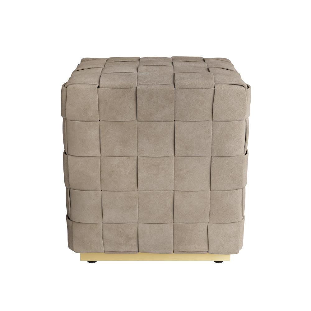 Inspired by artisanal Italian leatherwork, the Lakewood ottoman exemplifies fine craftsmanship. Wide strips of dove suede are interlaced to create a rich woven volume. As comfortable as it is beautiful, an antique brass plinth base adds a hint of shine to this refined aesthetic. Suede will vary.