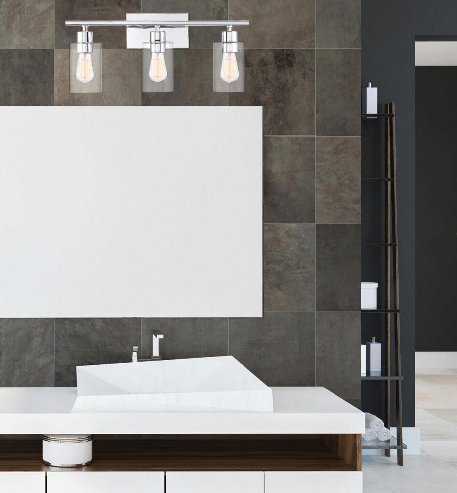Chic, contemporary style defines the Lambert. The straight lines of the light bar, cylindrical glass shades, bulb sockets, and backplate have an uncluttered, modern aesthetic. And the beautiful polished chrome finish is pure elegance. This streamlined design works extremely well with transitional decor, too —a terrific choice in your bathroom, dressing area, or powder room. Three 60W, E-style bulbs are visible through the clear glass shades, providing superb illumination. The fixture is 22” wide by 9.75” high and reversible: you choose whether to mount it as uplight or downlight. You’ll definitely like what you see when you have the stylish Lambert above your mirror.