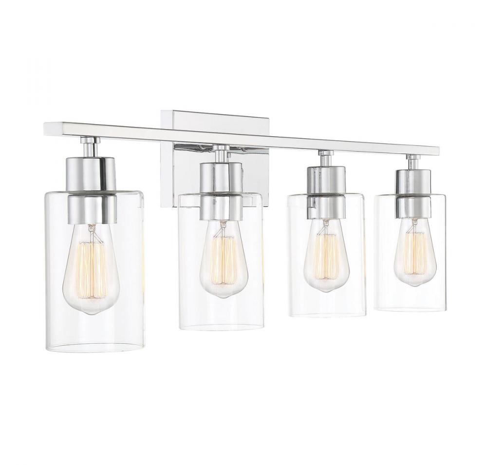 Chic contemporary style defines the Savoy House Lambert 4-light bath vanity light. The straight lines of the light bar, the cylindrical glass shades and the backplate have an uncluttered, modern aesthetic while the beautiful polished chrome finish is pure elegance. This streamlined design works extremely well with transitional decor, too, making it a terrific choice in your bathroom, dressing area or powder room. Four 60W standard size bulbs are visible through the clear glass shades, providing superb illumination. The fixture is 30.88" wide by 9.75" high and reversible, so you choose whether to mount it as uplight or downlight. You’ll definitely like what you see when you have the stylish Lambert above your mirror.