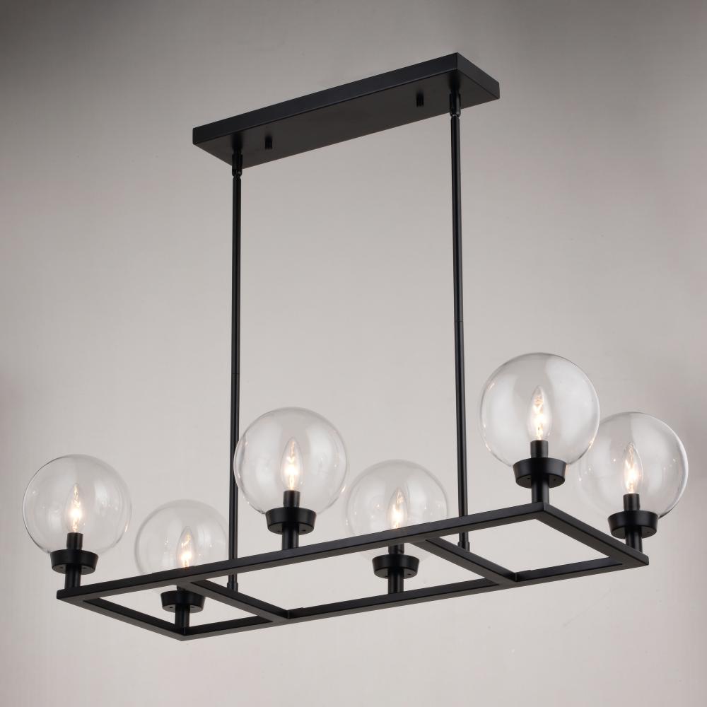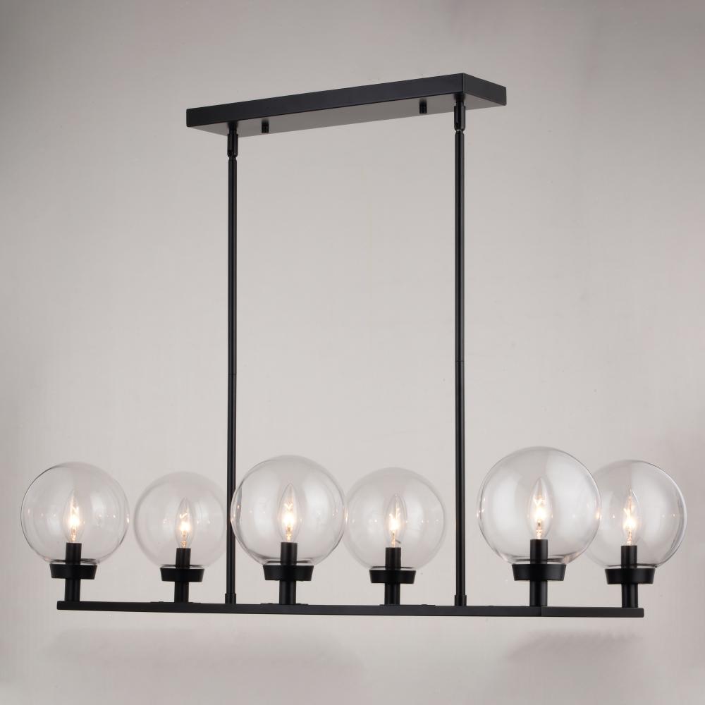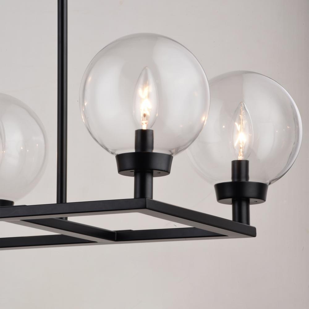 The Lander indoor lighting collection is contemporary style with flair. Distinctive arms finished in matte black support and highlight the clear glass globes. Hung with downrods suitable for vaulted ceilings, this linear chandelier is a perfect addition to your kitchen, dining area, or any other living area where a little extra style is desired.