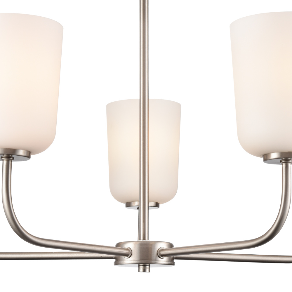 The Laphia Family features sleek lines, a graceful profile, and brilliant white, bell-shaped glass shades creating an ambient glow. The Family is available as sconce, chandelier, pendant, mini-pendant, semi-flush mount, flush mount, and an excellent vanity task light. Perfect for any interior plan from Craftsmen to modern farmhouse, these fixtures are finished in stylish brushed nickel, matte black, or modern gold.
