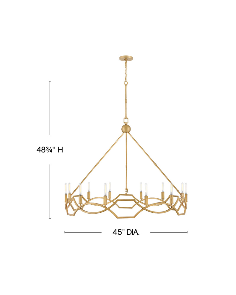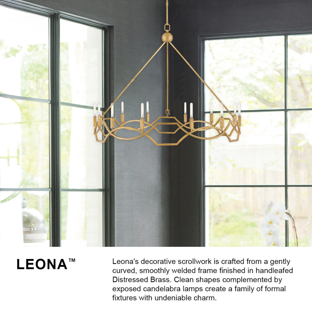 Leona’s decorative scrollwork is crafted from a gently curved, smoothly welded frame finished in hand-leafed Distressed Brass. Clean shapes complemented by exposed candelabra lamps create a family of formal fixtures with undeniable charm.
