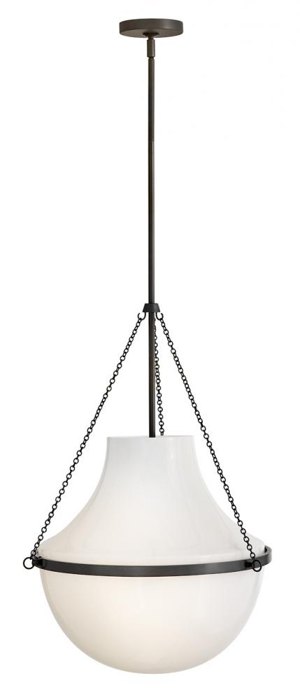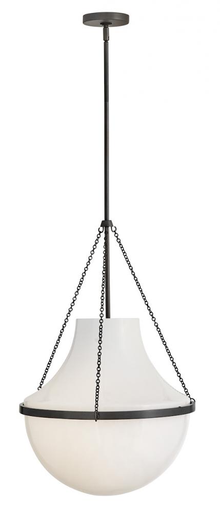 Fusing a sculpted, modern form with classically styled details, Collins features a transitional teardrop shade crafted from blown, cased opal glass. A central metal band and delicate chain uprights are available in Heritage Brass or Black Oxide finishes.