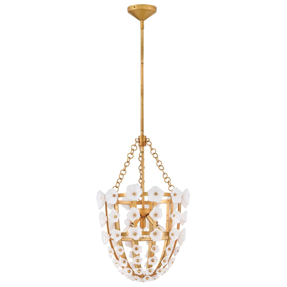 Inspired by the natural romance of annual spring blooms, Azalea’s intricate silhouette is adorned with double-layered glass blossoms crafted from clear and white glass. A Distressed brass frame complements an abundance of warm, ambient illumination from dimmable candelabra lamps.
