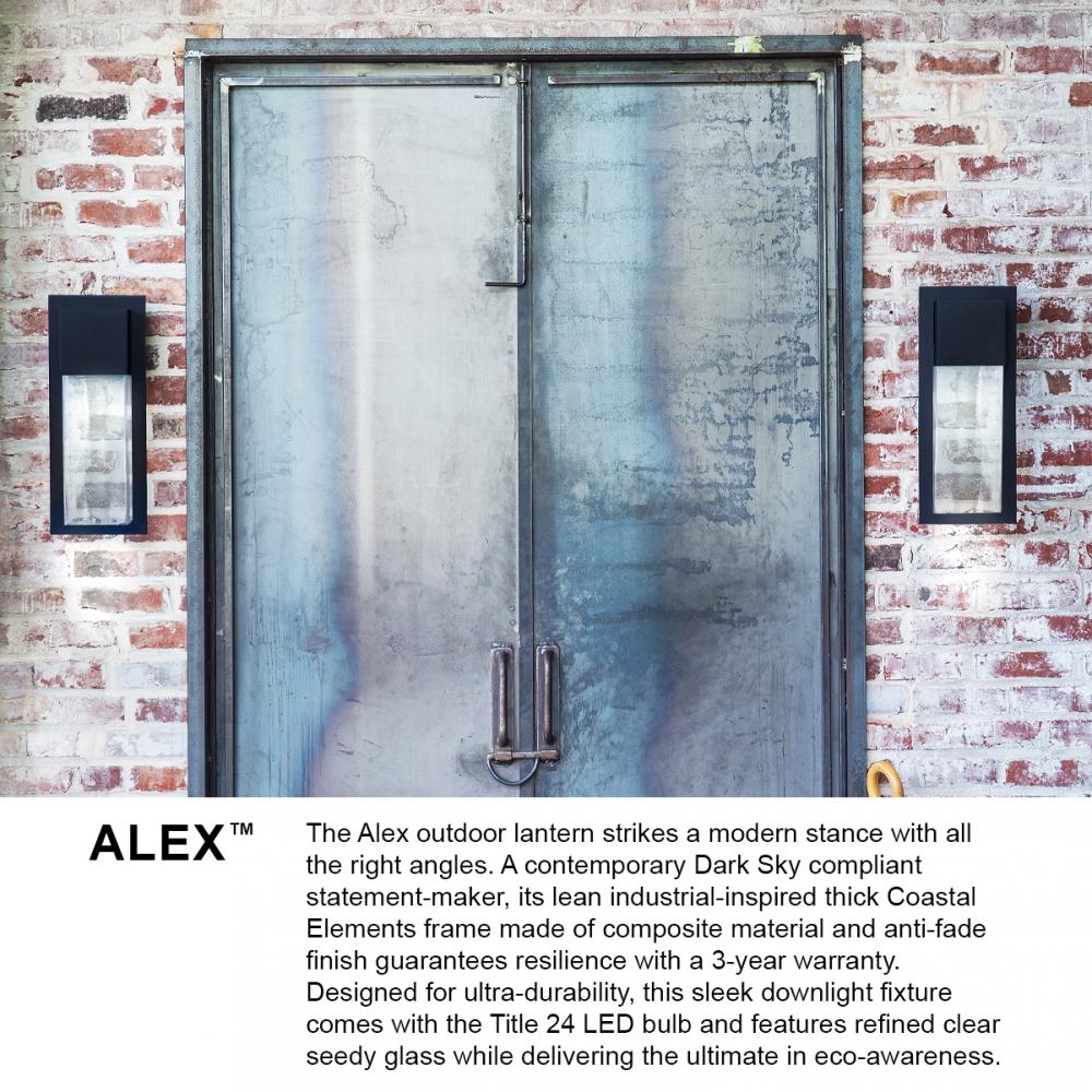 The Alex LED outdoor lantern strikes a modern stance with all the right angles. A contemporary statement-maker, its industrial-inspired thick Coastal Elements frame made of compositematerial and anti-fade finish guarantees resilience with a 3-year warranty. Designed for ultra-durability, this downlight fixture comes with an LED bulb and is available in versatile Antique Brushed Aluminum or Black finish options. Alex is equally happy indoors, turning heads as an interior wall sconce.