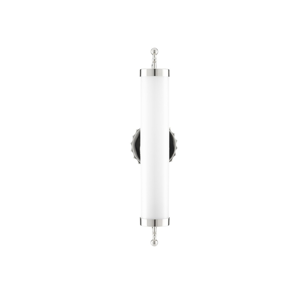 The Latimer Nickel Wall Sconce in our Barry Goralnick Collection is made of metal in a polished nickel finish and a tubular milk-glass shade. This silver sconce is certified for damp locations.