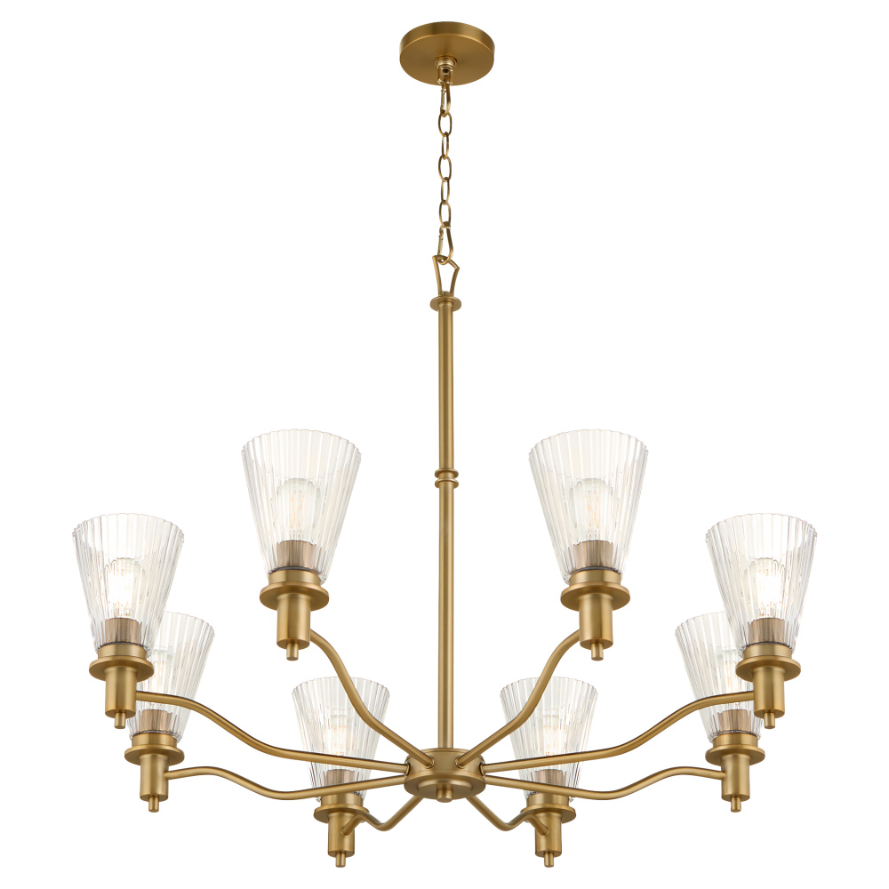 Lawton is a playful transitional series featuring pleated conical glass, ramped arms, and contemporary finishing. Early American and European styles inspired the clean bobeche, breaks, and steps in the details. Available in matte black or brushed brass, this chandelier offers versatility with 5 or 8 light options. Whether placed in living rooms, kitchens, or entryways, Lawton adds a welcoming touch to any décor.