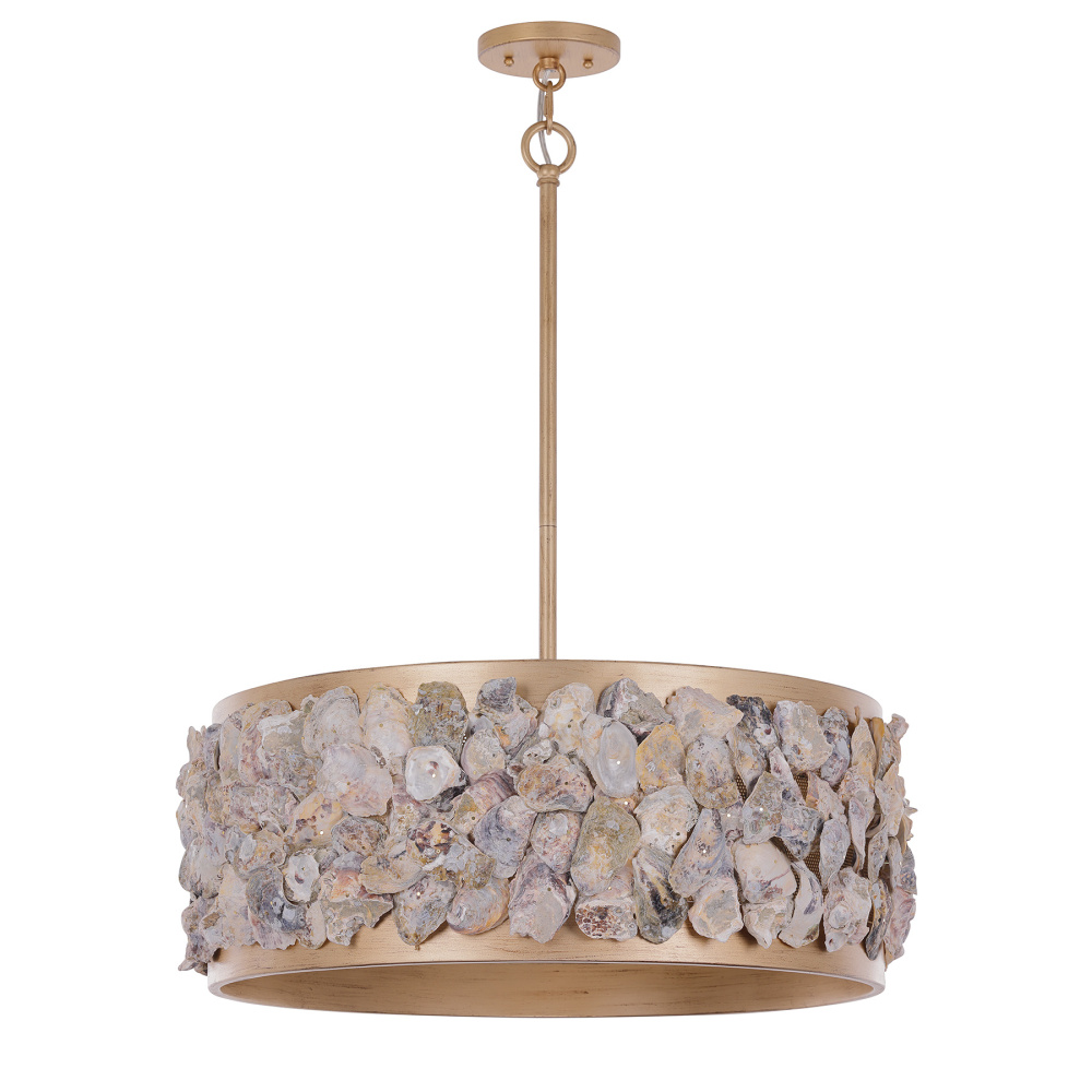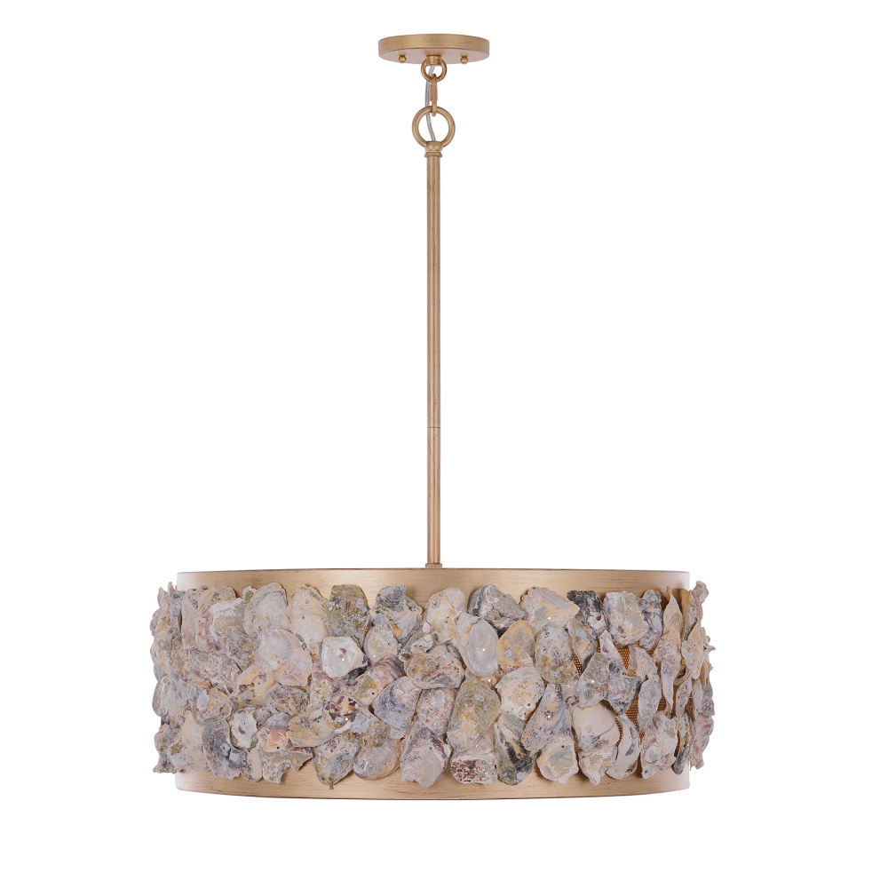 The Savoy House Leanne 4-light pendant was designed by award-winning interior designer and TV host Breegan Jane. Softly radiant and beautifully crafted, Leanne brings a curated, coastal touch to your space. Genuine oyster shells, each one unique, form a shimmering ring that reflects the light in subtle, sea-washed tones. The hand-painted Chandon finish pairs perfectly with the shell’s natural luster, creating a warm, inviting presence. Leanne is 24" in width and has an adjustable height ranging from 9.5" to 63.5". It uses four candelabra size bulbs of up to 60 watts per bulb. Bulbs not included. Comes with four 12" downrods and one 6" downrod.
