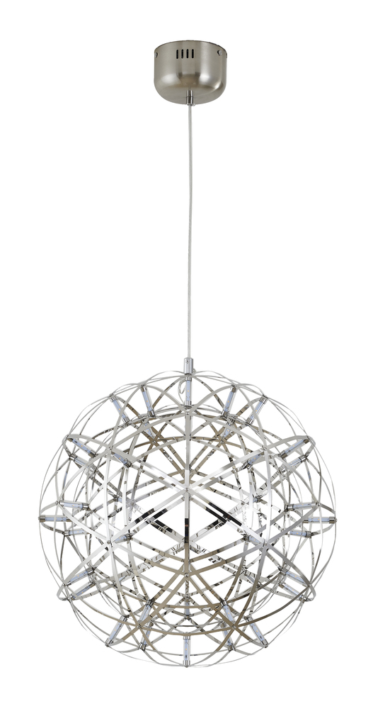 This globe LED lighting fixture is in a chrome finish. The frame is made out of stainless steel and there are forty-two LED lights on the frame. This is fixture can be used in any room, entryways and more.