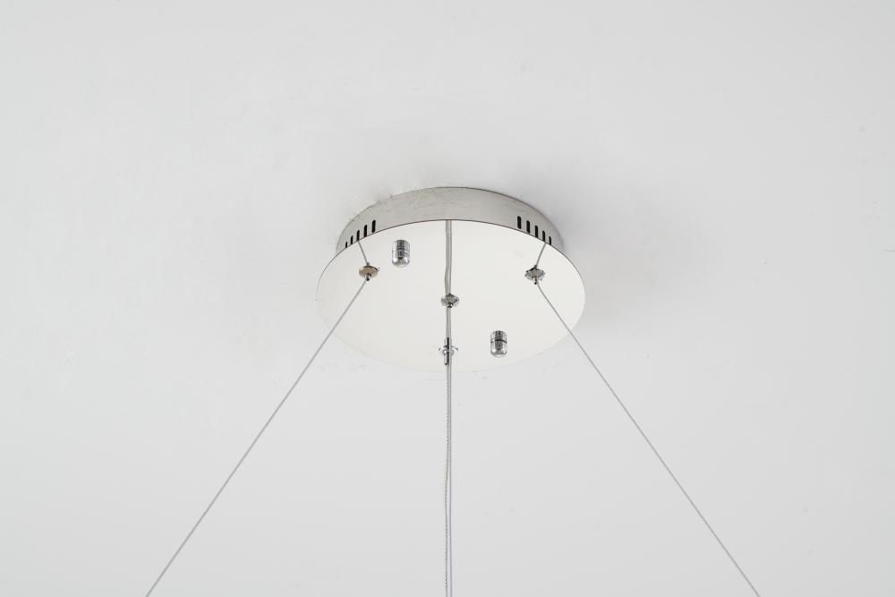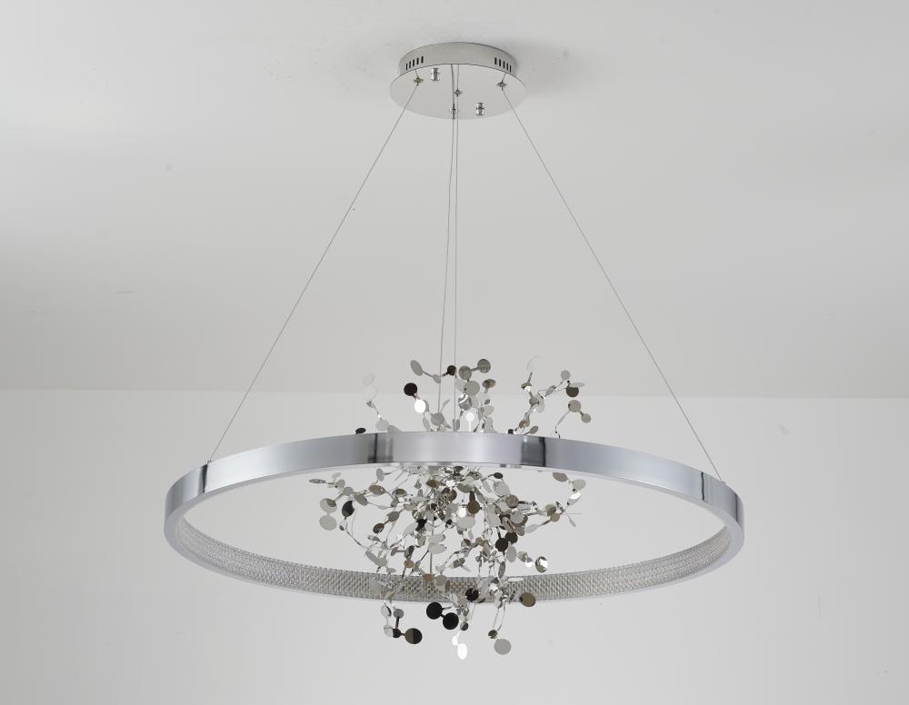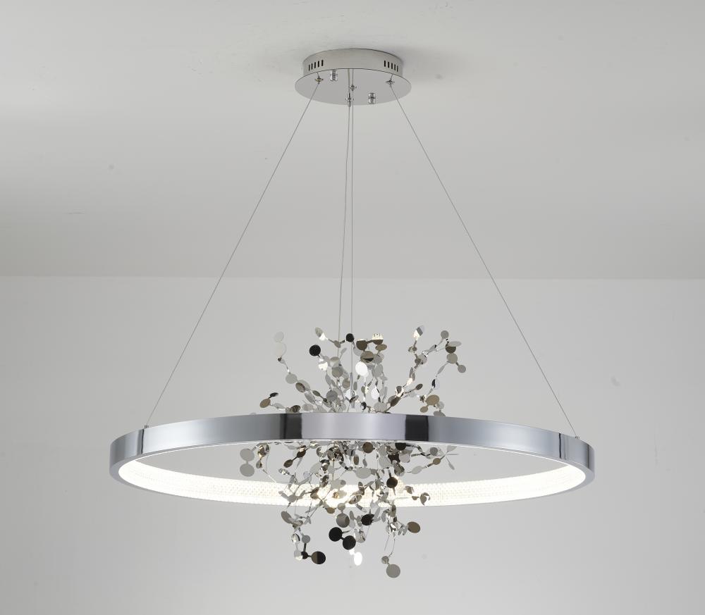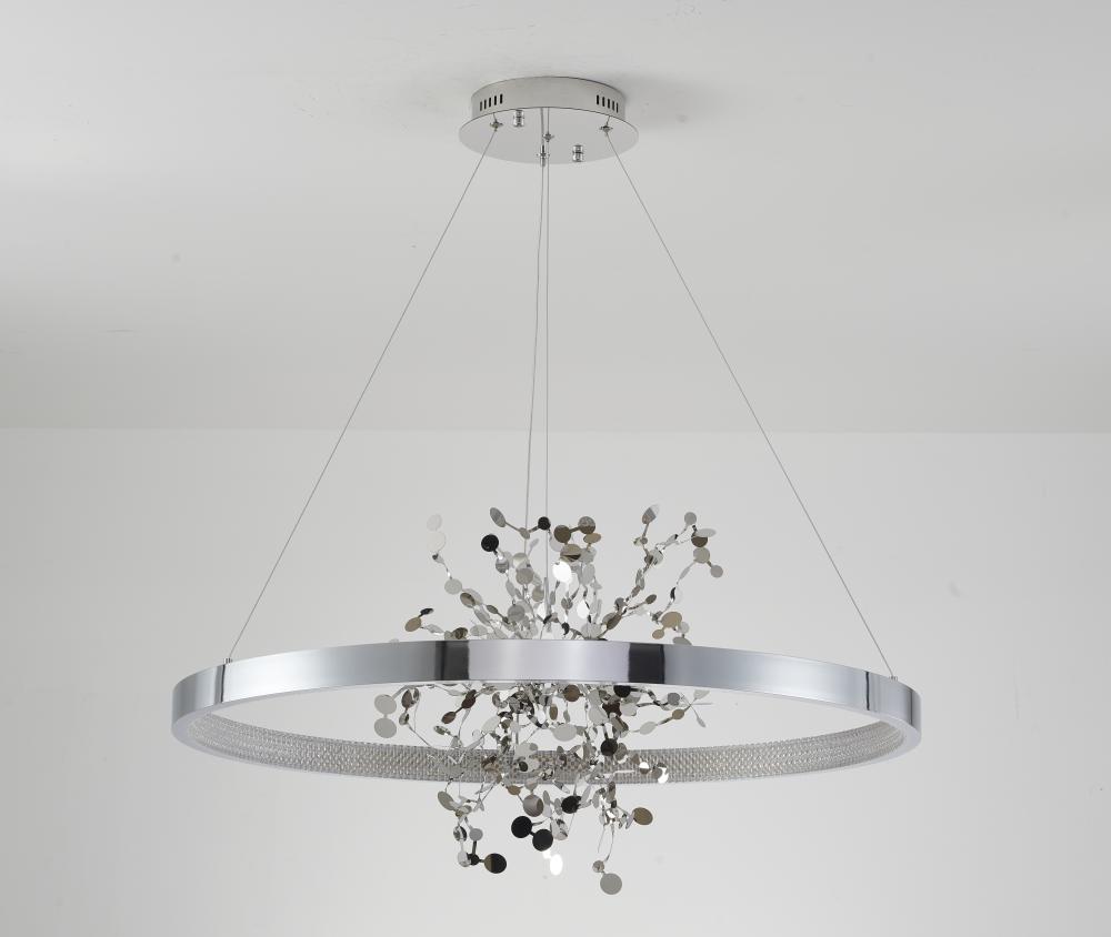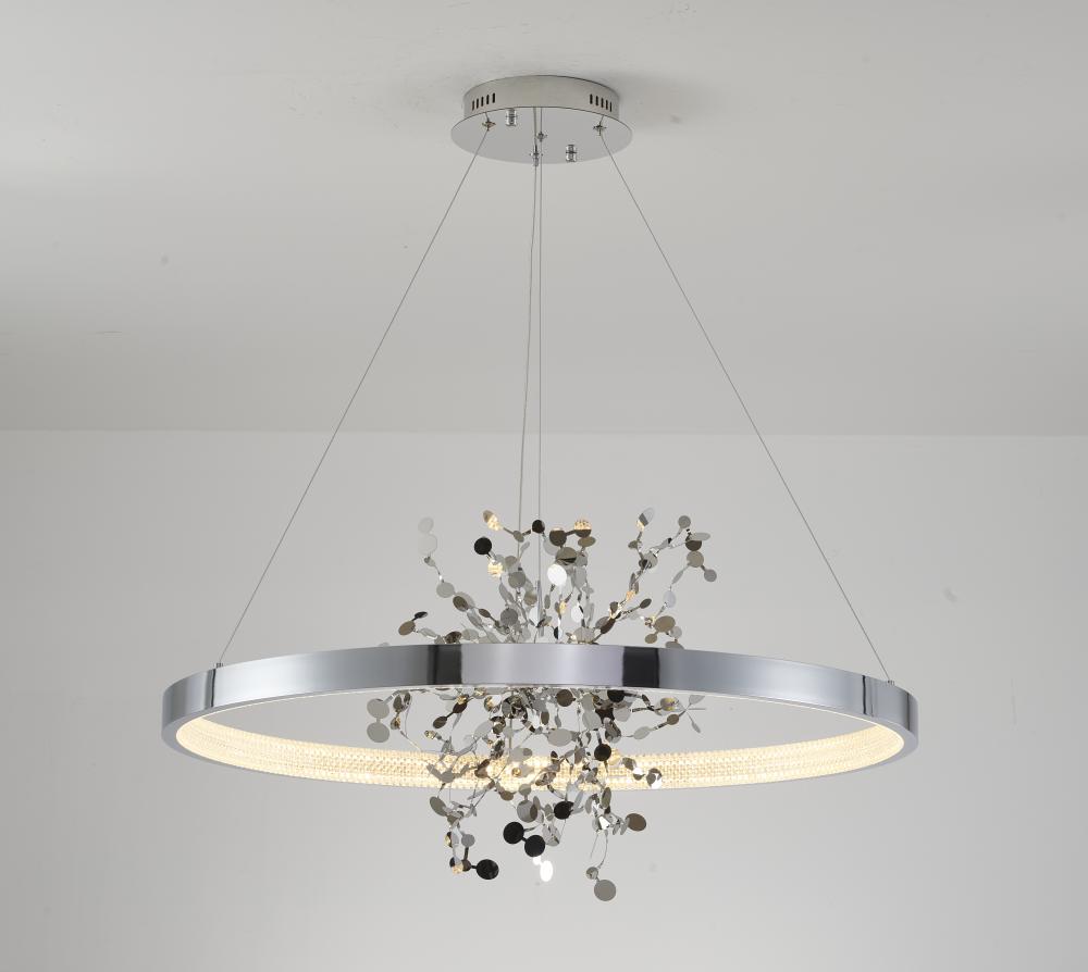 This chandelier is a chrome frame chandelier. It comes with a chrome stainless steel confetti interior and a transparent diffuser. This chandelier can change to three LED color temperatures such as 3000K, 4000K and 6000K.