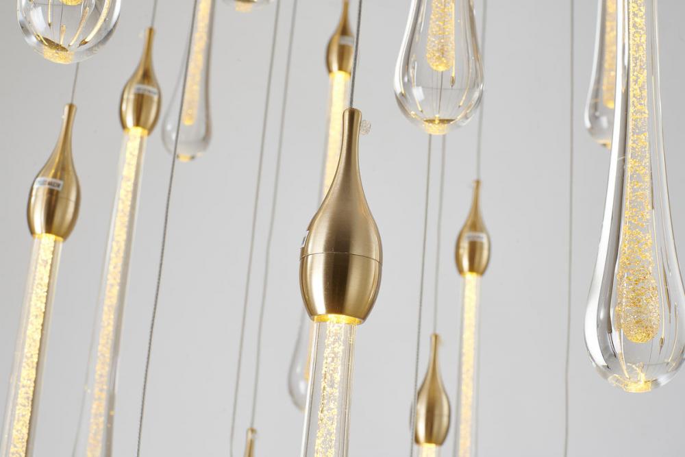 This modern LED lighting has a gold metal frame and dusted glass hanging pendants