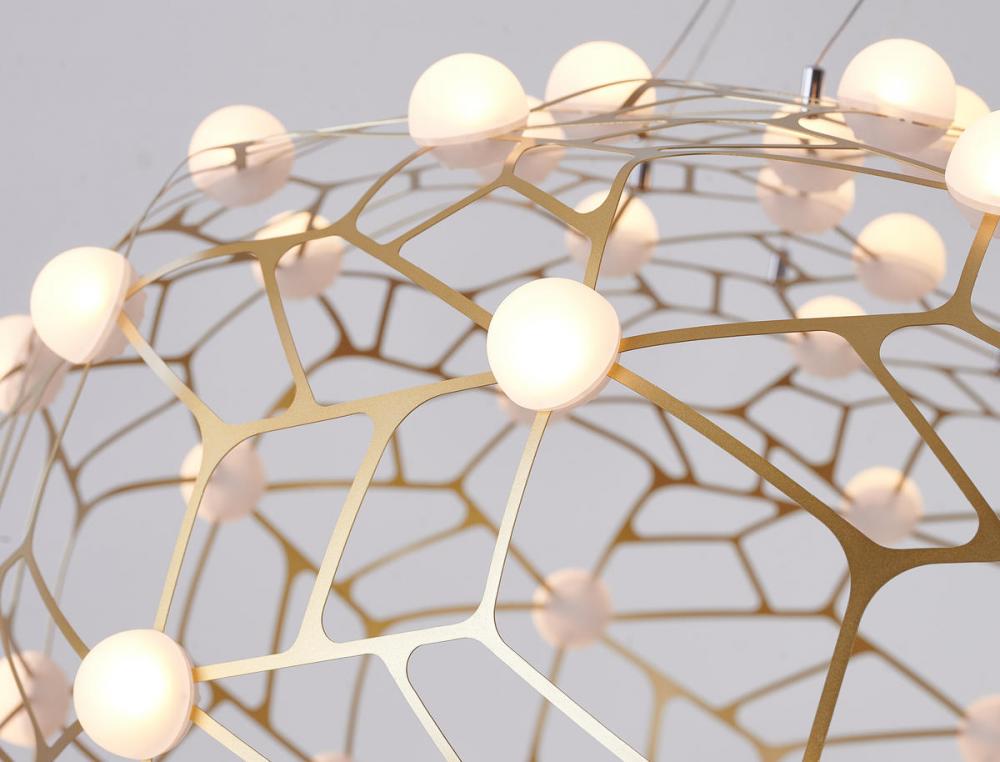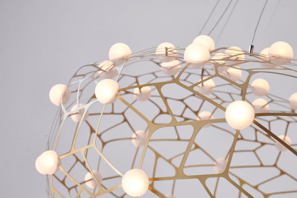 This exquisite LED chandelier is in a gold finish. The frame is made out of iron in an oval honeycomb shape. The LED bulbs are integrated into the frame. It comes with white acrylic diffusers. The adjustable cord links make this fixture suitable for most ceiling heights.