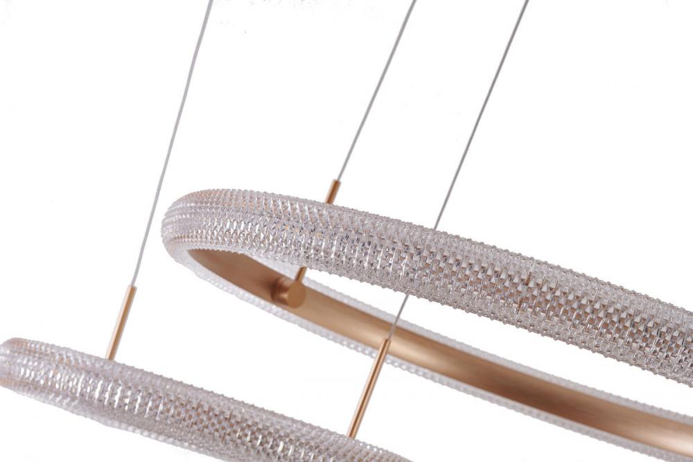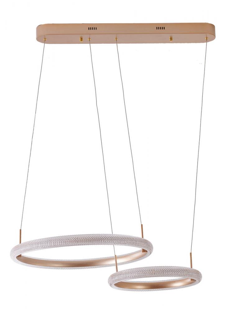This exquisite LED chandelier is in a gold finish. The frame is made out of iron, and it comes with white acrylic diffusers. The LED bulbs are integrated into the frame. The adjustable cord links make this fixture suitable for most ceiling heights.