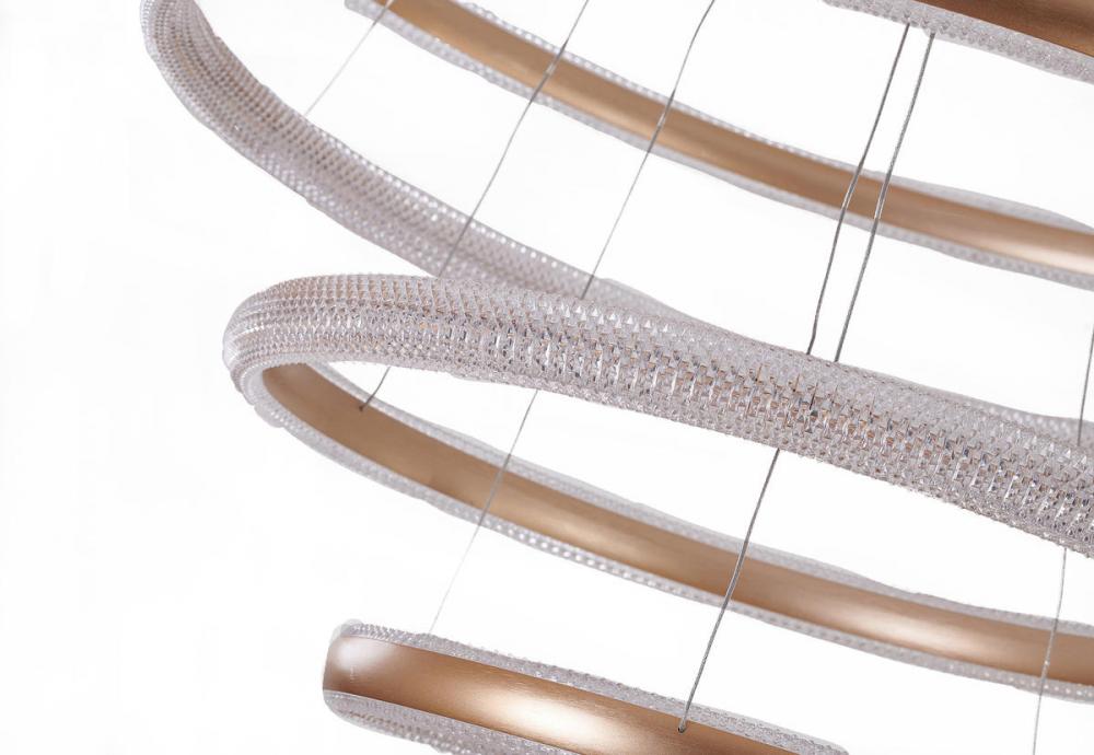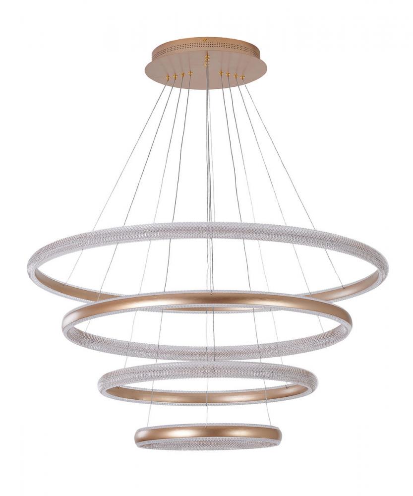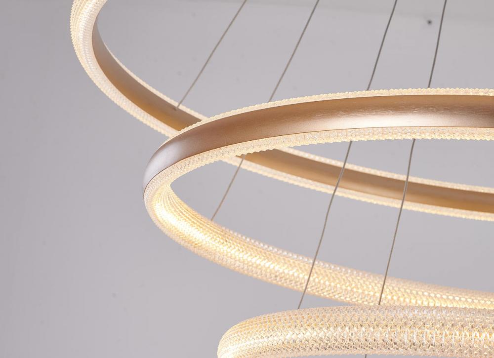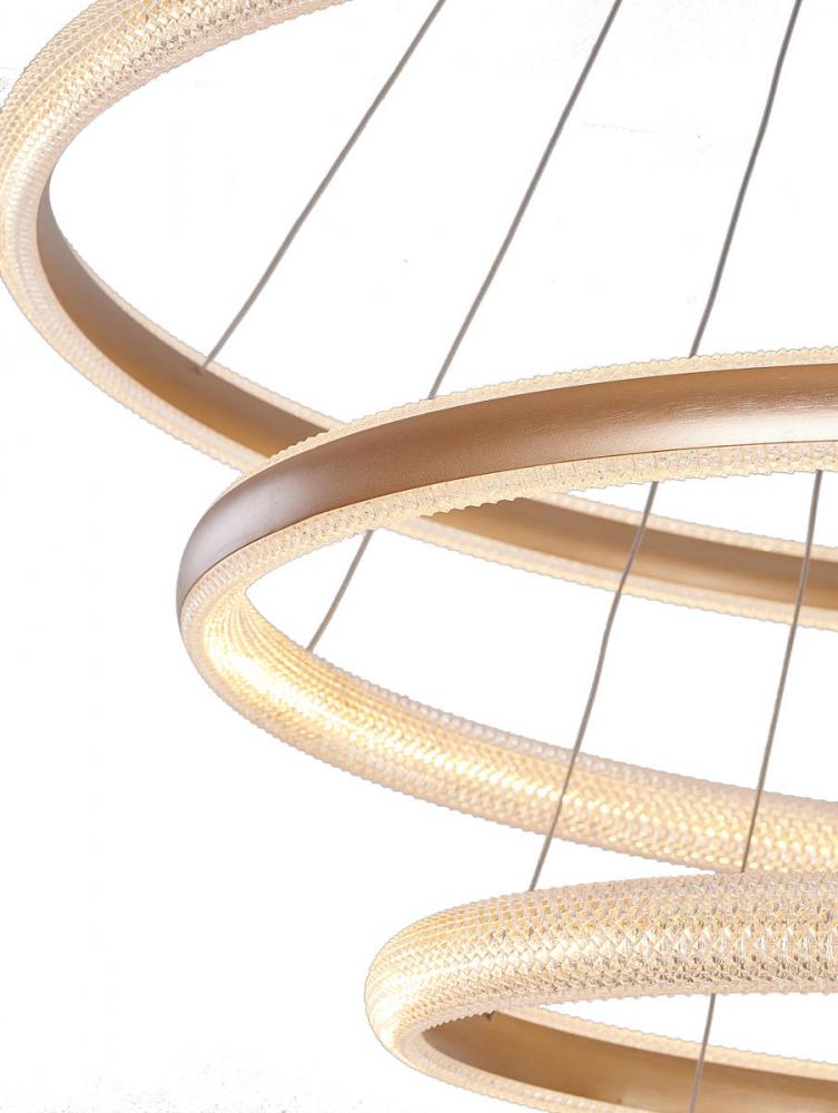 This exquisite LED chandelier is in a gold finish. The frame is made out of iron, and it comes with white acrylic diffusers. The LED bulbs are integrated into the frame. The adjustable cord links make this fixture suitable for most ceiling heights.