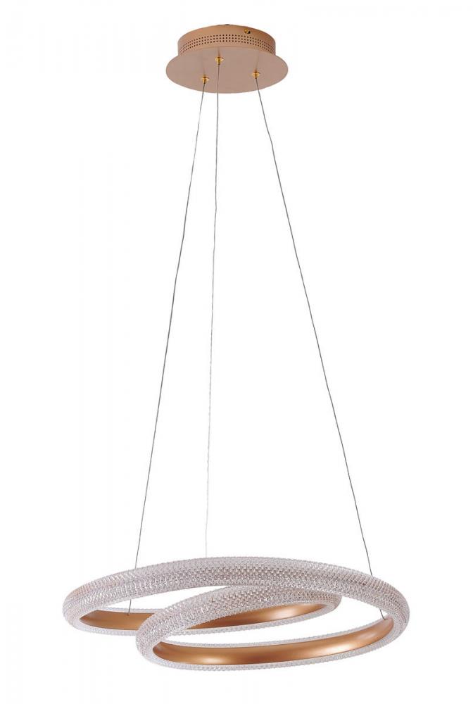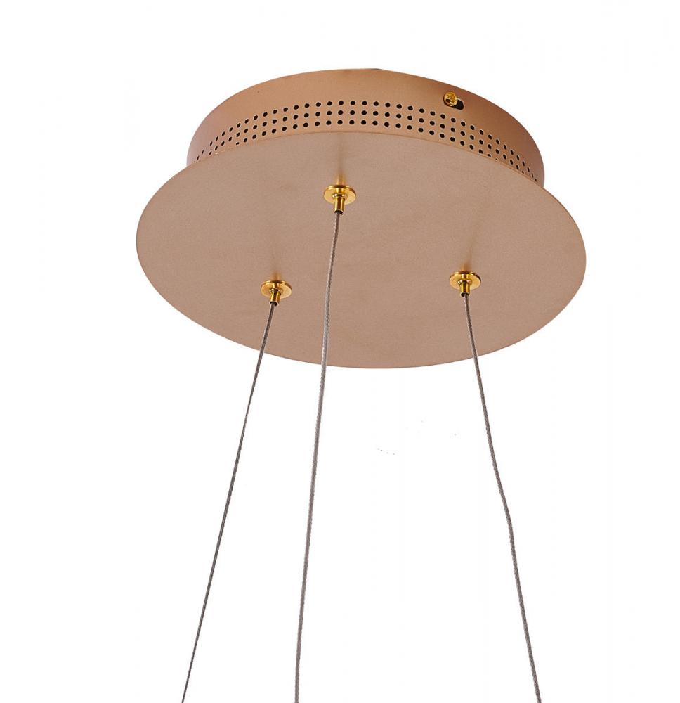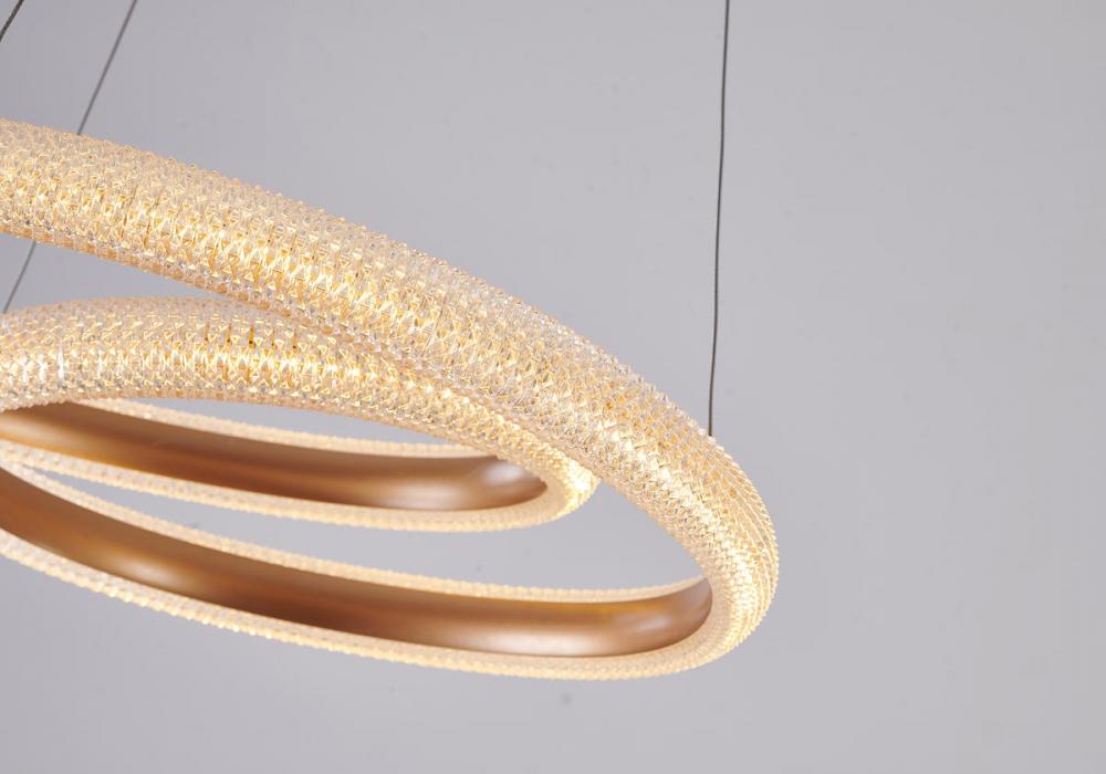 This exquisite LED chandelier is in a gold finish. The frame is made out of iron, and it comes with white acrylic diffusers. The LED bulbs are integrated into the frame. The adjustable cord links make this fixture suitable for most ceiling heights.