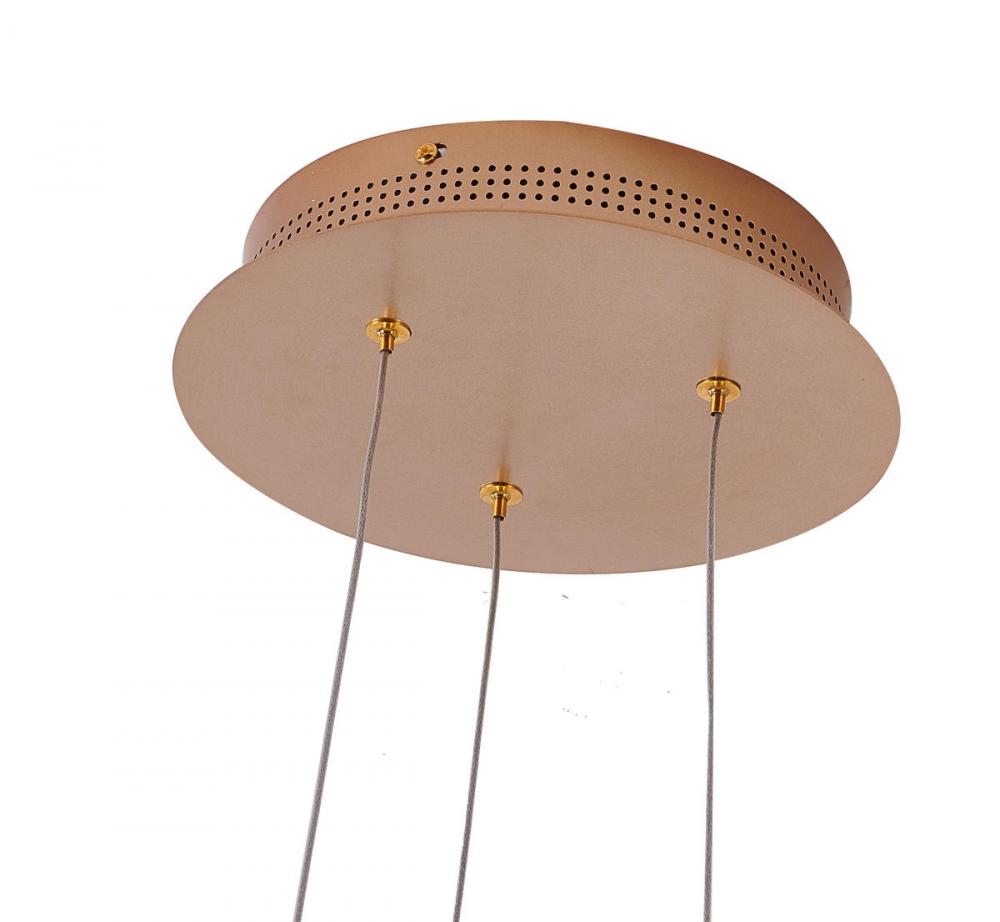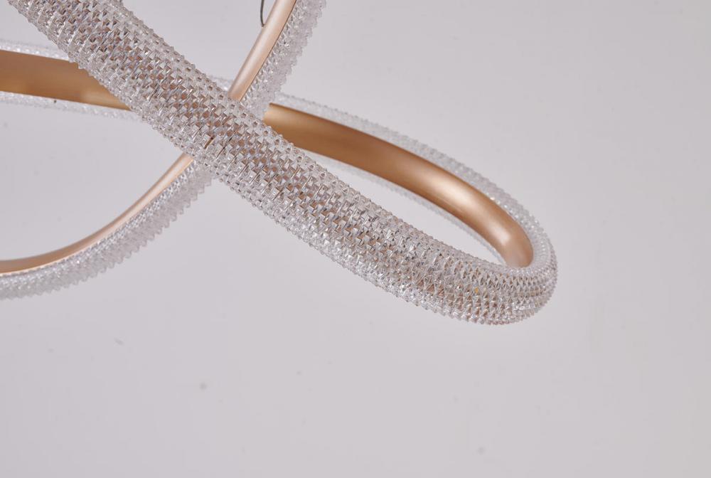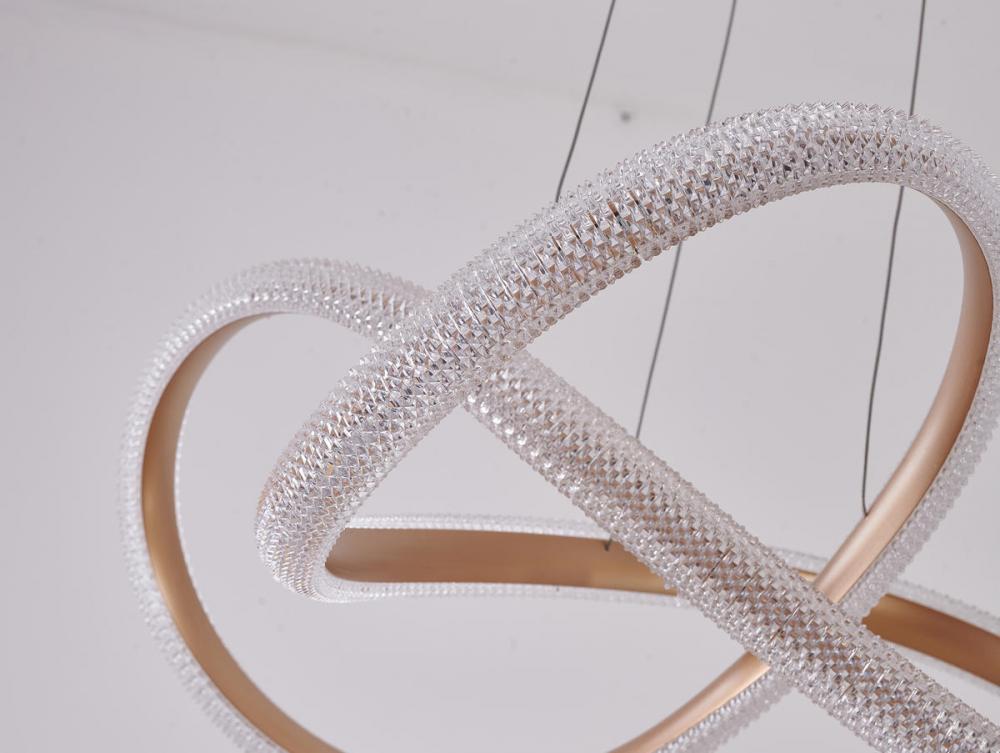 This exquisite LED chandelier is in a gold finish. The frame is made out of iron, and it comes with white acrylic diffusers. The LED bulbs are integrated into the frame. The adjustable cord links make this fixture suitable for most ceiling heights.