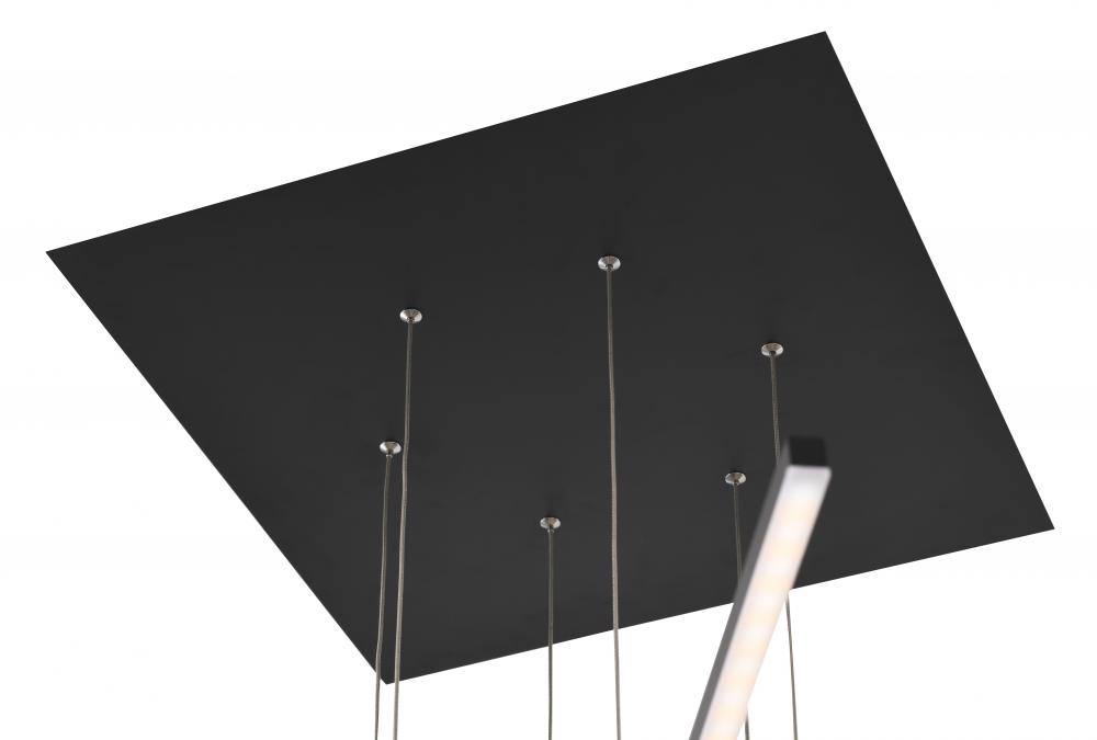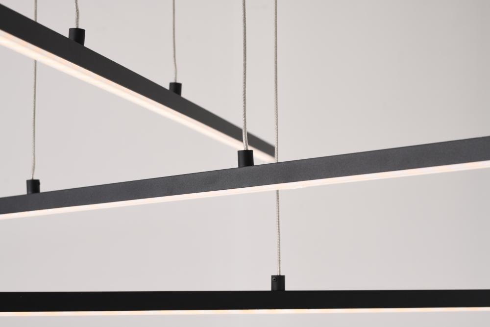 This chandelier is in a matte black finish. It comes with hanging stick pendants and chrome hardware. The cord length of 1.8 + 1.7 + 1.6 meters is provided and the cord length is adjustable.