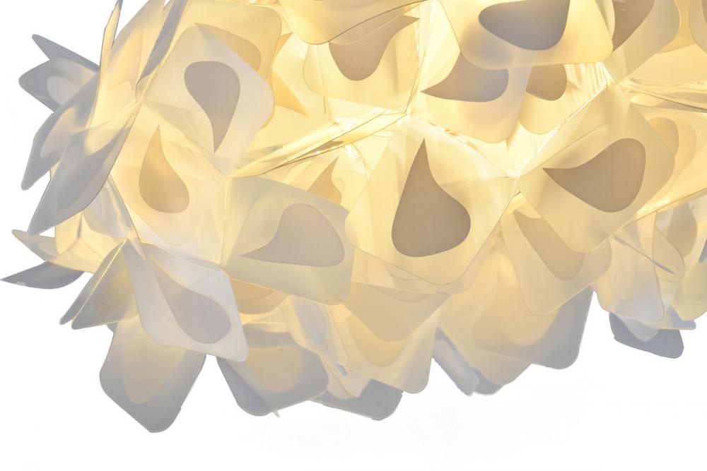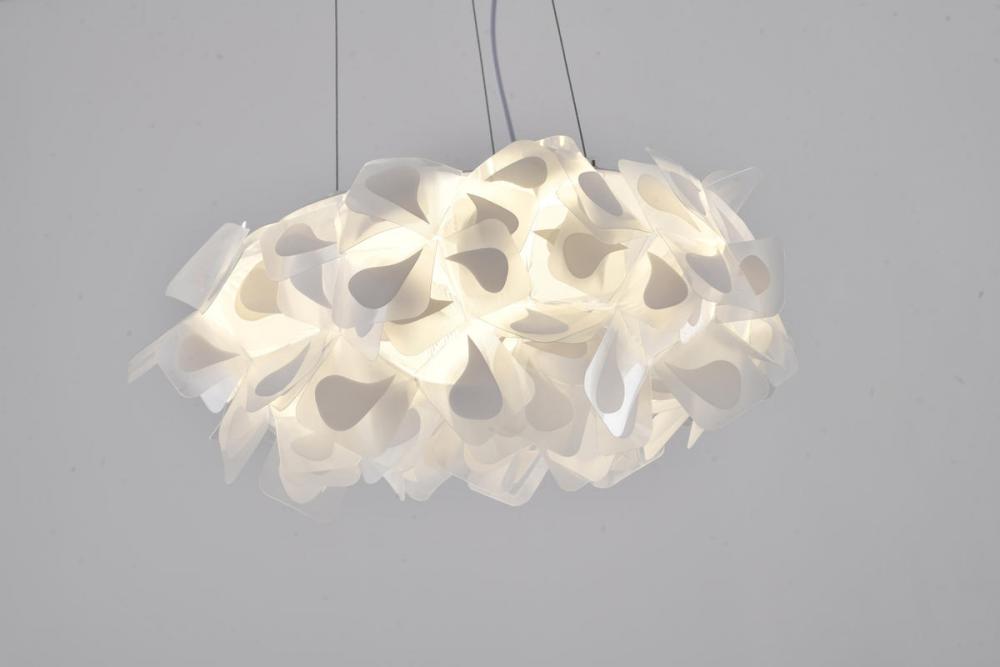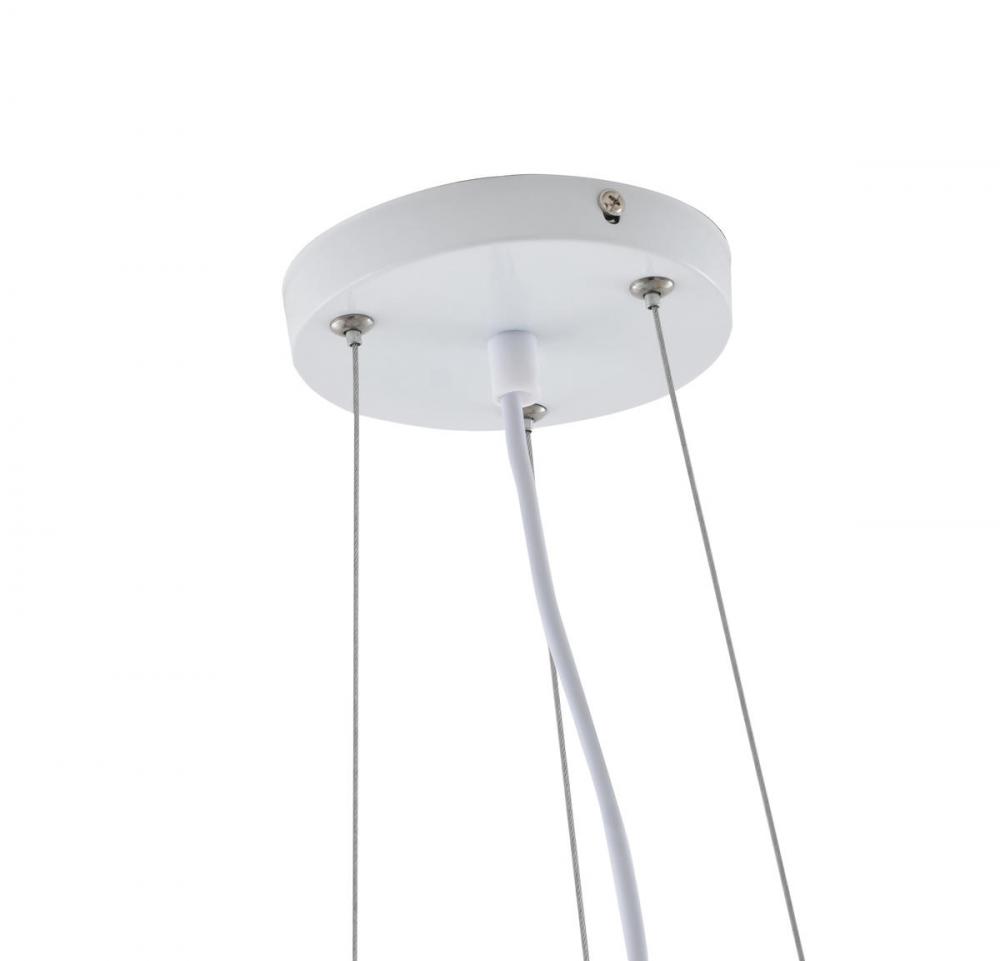 This unique LED chandelier is in a white finish. The frame is made out of metal, and the LED bulb is integrated into the frame. It comes with a white acrylic shade in an abstract cloud shade. The adjustable cord links make this fixture suitable for most ceiling heights.