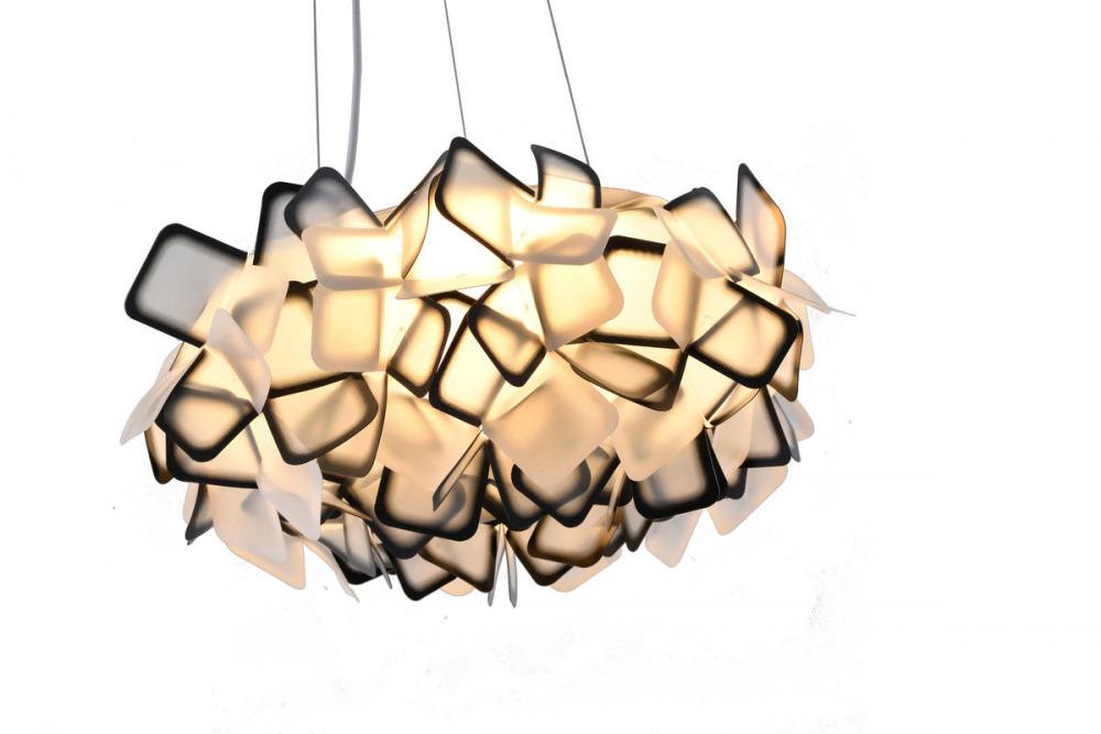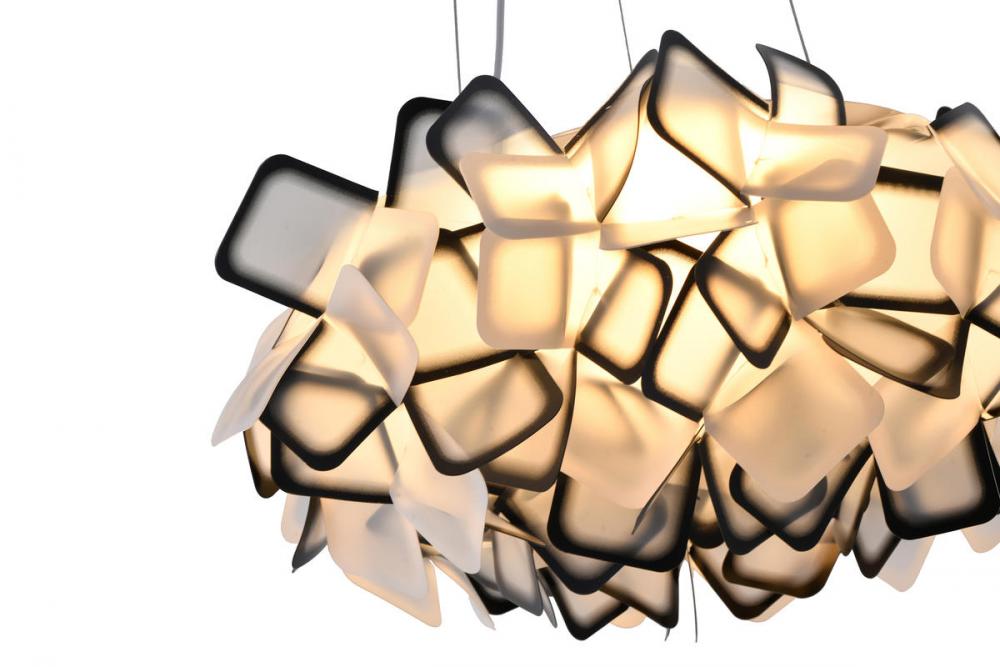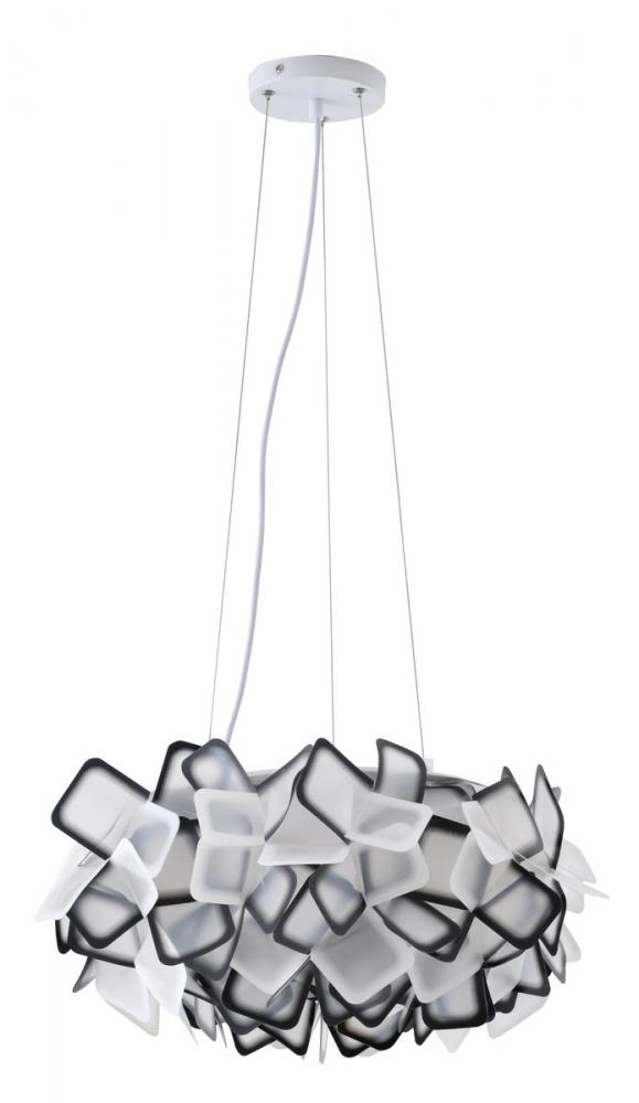 This unique LED chandelier is in a white finish. The frame is made out of metal, and the LED bulb is integrated into the frame. It comes with a white and black acrylic shade in an abstract cloud shade. The adjustable cord links make this fixture suitable for most ceiling heights.