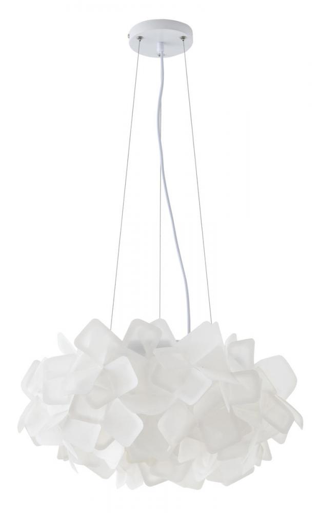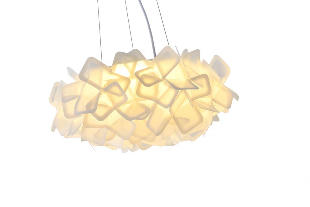 This unique LED chandelier is in a white finish. The frame is made out of metal, and the LED bulb is integrated into the frame. It comes with a clear acrylic shade in an abstract cloud shade. The adjustable cord links make this fixture suitable for most ceiling heights.